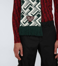 Knit from wool and cashmere in a geometric, jacquard pattern, this white and bottle green scarf from Prada has fringed edges, and is embroidered with the label's triangle logo on one end. Product Details - Frayed ends - Material: 70% wool, 30% cashmere - Care instructions: dry clean - Made in Italy - Item number: P00588843 Size & Fit - Length 170cm-67" - Width 18cm-7" - Length of fringe 8cm-3"