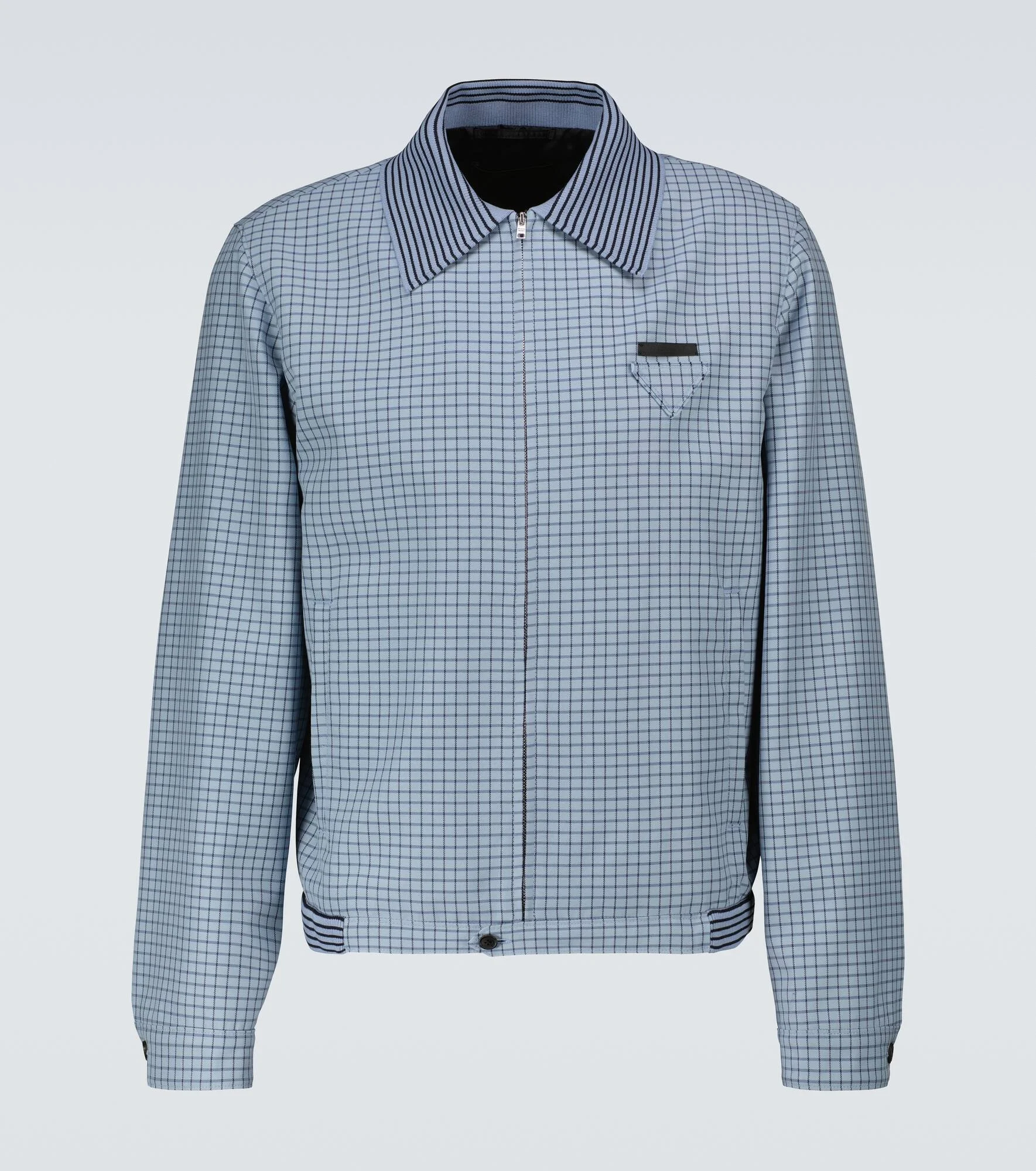 Prada's light blue checked blouson jacket has a retro-inspired quality, featuring a tonal triangle logo patch, striped ribbed trims and side straps at the hem for an adjusted fit. Product Details - Material II: 73% silk, 18% polyamide, 9% elastane - Made in Italy - Material: 100% virgin wool - Designer color name: Avio - Closure: button fastening, zipped front - Lining: 100% viscose, fully lined - Buttoned cuffs - Pockets: side slit pockets - Care instructions: dry clean - Item number: P00521883 Size & Fit - True to size - Designed for a loose fit - Falls to the hip - The model in the picture is 185cm-6'1" and wearing a size IT 48