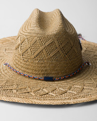 This woven straw hat has an allure country mood. The accessory with a wide brim is decorated with the enameled metal triangle logo. - Product code: 2HC317_042_F0O0M - Enameled metal triangle logo - Imported MATERIALS Main material: Soft rush