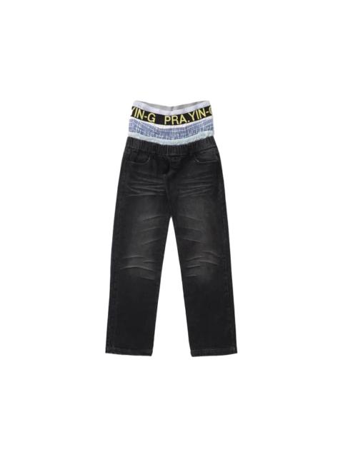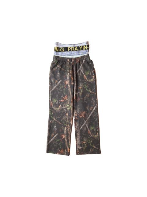 The Praying Real Tree Underwear Sweatpants in camoflauge are layered pull-on pants featuring multiple boxer-short inspired waistbands with logo print, an elasticated waist, side pockets, and single back patch pocket. DETAILS - Layered styling - Pull-on pants - Logo at waist - Side pockets - Elasticated waistband - Back patch pocket Material: Cotton Made in China Product codes: - SKU: ESSX/PRA/AW25/PRAY240853/Green/XS - UPC: 1403558052009