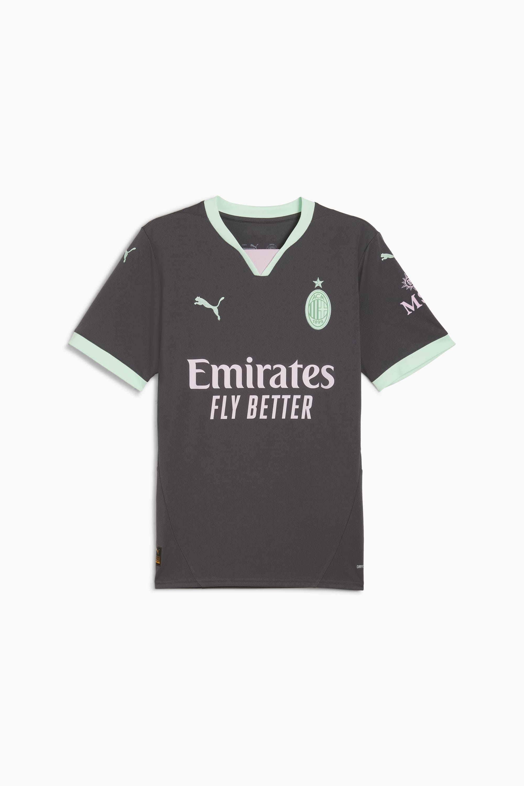PRODUCT STORY You know Milanismo when you see it. In the 24/25 Third Kit, bold accents light up the neutral base color to express the inherent Milanese style in a way that's both new and distinctly Rossonero, even in the absence of Rosso or Nero. FEATURES & BENEFITS - dryCELL: Performance technology designed to wick moisture from the body and keep you free of sweat during exercise - As part of the RE:FIBRE program, this garment is made of at least 95% recycled material from textile waste and other used materials DETAILS - Style: 775031_03 - Color: Shadow Gray-Fresh Mint - Regular fit - 170 gsm, Jacquard - Crew neck - Short sleeves - Official team branding MATERIAL INFORMATION - SHELL: 100% polyester - RIB: 100% polyester