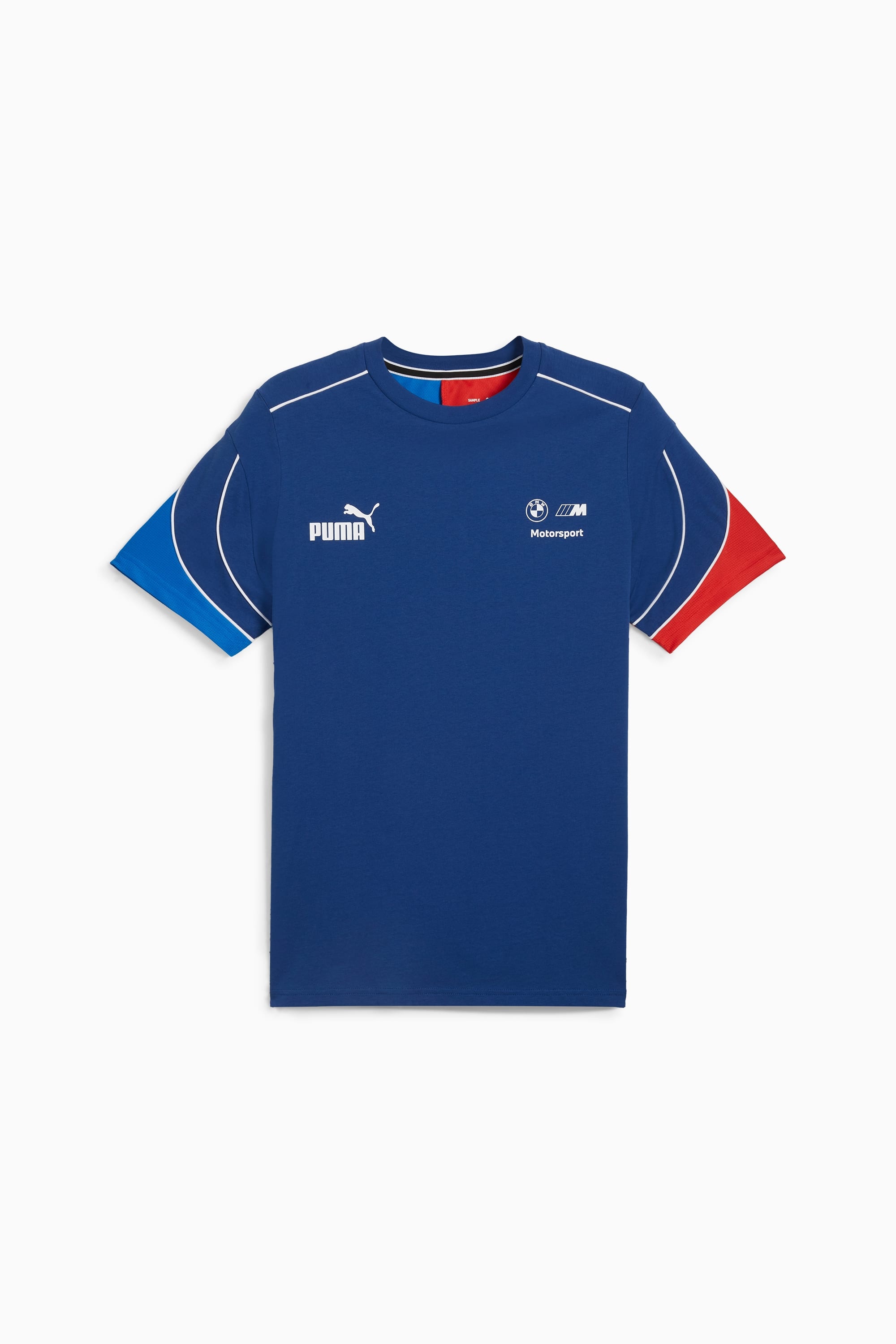 PRODUCT STORY A PUMA original, the T7 track-inspired collection made a name for itself with 7cm signature stripes and quickly became as popular on city streets as it was on the training grounds. The styles are just as iconic today as they were back then. The BMW M Motorsport MT7+ tee has been created especially with motorsport fans in mind. It has a comfortable fit with striping on the sleeves and shoulders and BMW M Motorsport branding details. FEATURES & BENEFITS - Made with at least 50% recycled materials DETAILS - Style: 627455_04 - Color: Pro Blue-M Color - Regular fit - 160 gsm, single jersey - Crew neck - Short sleeve MATERIAL INFORMATION - SHELL: 100% cotton - BACK PANEL: 100% polyester - RIB: 70% cotton, 30% polyester