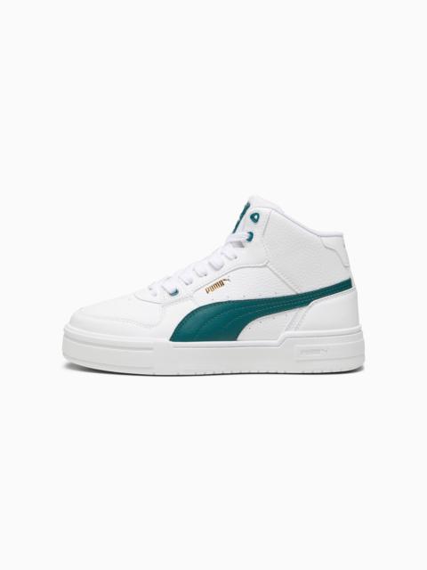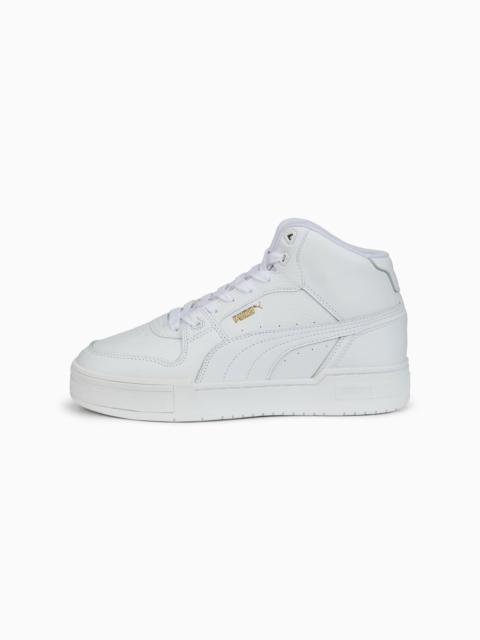PRODUCT STORY Our CA Pro takes inspiration from the original California we released back in the ‘80s. It has a look that’s both classic and modern, featuring a perforated toe – just like the OG – statement panelling, and the famous PUMA Formstrip. This pair has an raised collar, sitting just above the ankle to add a sporting edge. DETAILS - Style: 386759_01 - Color: Puma White-Puma Team Gold - Mid boot - Leather upper - Perforated toe - Rubber outsole - PUMA Formstrip on the medial and lateral side - PUMA Cat Logo on the heel MATERIAL INFORMATION - Sockliner: 100% Textile - Outsole: 100% Rubber - Upper: 61.20% Synthetic, 36.88% Leather - cow, 1.92% Textile - Lining: 100% Textile