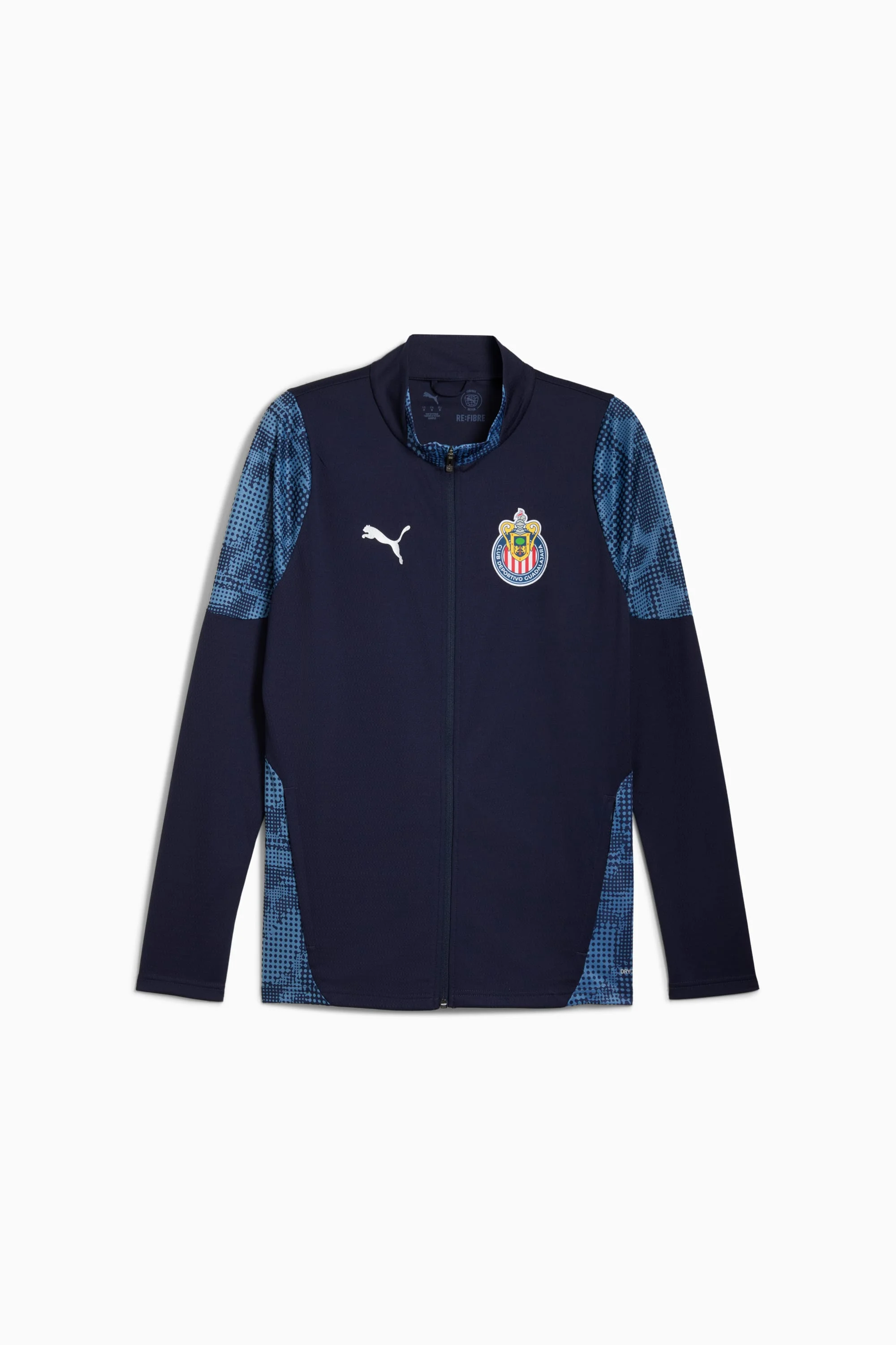 PRODUCT STORY Designed for peak performance, the official training collection is built for the demands of the 25/26 season. Worn by the pros, it combines cutting-edge materials with a precision fit to enhance every training session. Engineered for comfort, mobility, and club pride, this collection ensures players train at their best, day in and day out. FEATURES & BENEFITS - As part of the RE:FIBRE program, this garment is made of at least 95% recycled material from textile waste and other used materials DETAILS - Style: 782103_02 - Color: PUMA Navy-PUMA Silver - Worn by the players during the 25/26 season - Fit: Slim - Neck: Crew neck - Long sleeves - Fastener: Full zip - Length: Standard jacket - Main material: Double face jacquard - Club and PUMA branding details MATERIAL INFORMATION - Shell: 100% polyester - Pocket Bag: 100% polyester