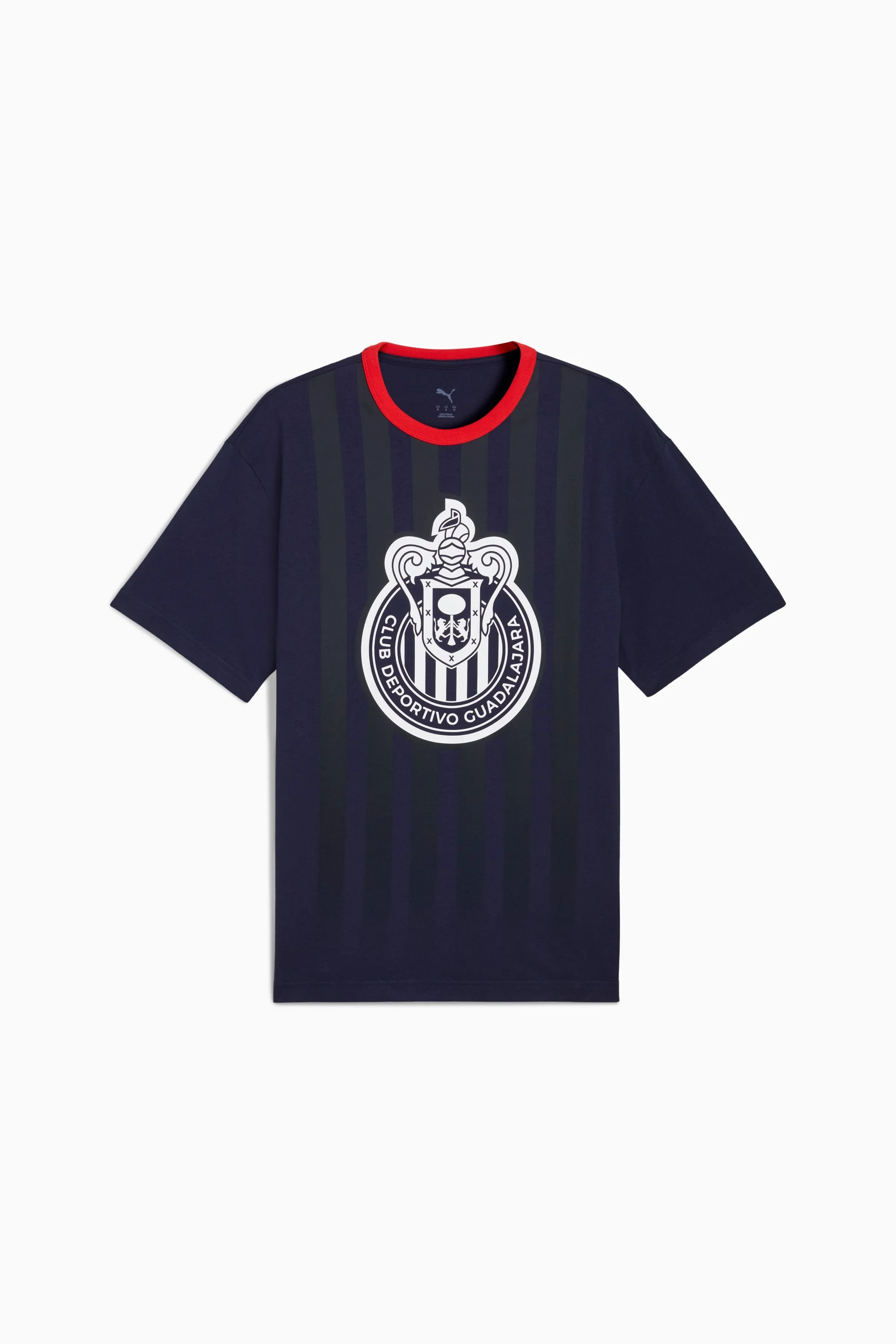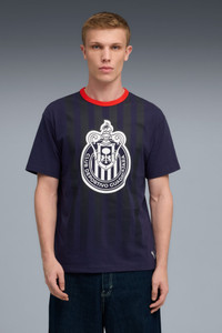 PRODUCT STORY Show your team pride in laid-back style. Made with soft jersey fabric, this tee provides all-day comfort whether you're at the game or hanging out with friends. Bold Chivas branding brings undeniable energy, making it perfect for showing your passion. PUMA quality meets soccer spirit—ready to win big. DETAILS - Style: 786006_06 - Color: PUMA Navy - Fit: Relaxed - Main Material: Single jersey - Neck: Crew - Short sleeves MATERIAL INFORMATION - Shell: 100% cotton - Rib: 71% cotton, 29% polyester