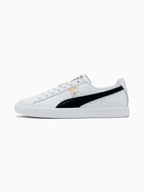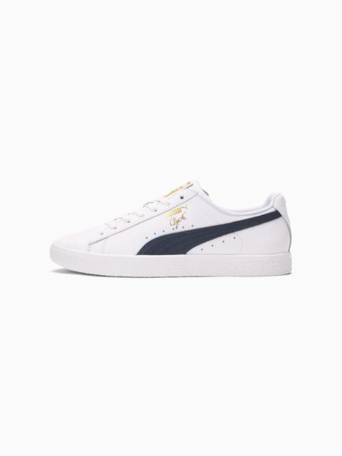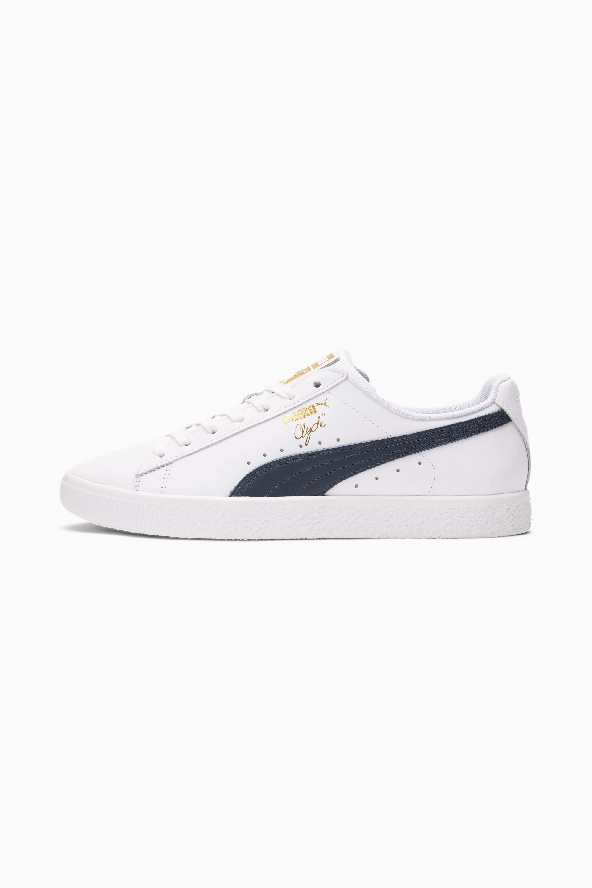 Pay tribute to a legend in this gold edition Clyde. Inspired by the legend himself, we created the PUMA Clyde back in 1973 just for basketball icon Walt "Clyde Frazier". Known for his on-court playstyle and off-court street style, the Clyde is all class and flash. This version is updated with gold foil branding and a premium leather upper. DETAILS - Style: 364669_02 - Color: Puma White-Puma New Navy-Puma Team Gold - Classic Clyde silhouette - Full leather upper - Flat lace closure for snug fit - Rubber outsole provides durable grip and traction - Contrast PUMA Formstrip overlay at side - Gold metallic PUMA Clyde callout at side - Gold foil PUMA label at tongue MATERIAL INFORMATION - Outsole: 100% Rubber - Upper: 100% Leather