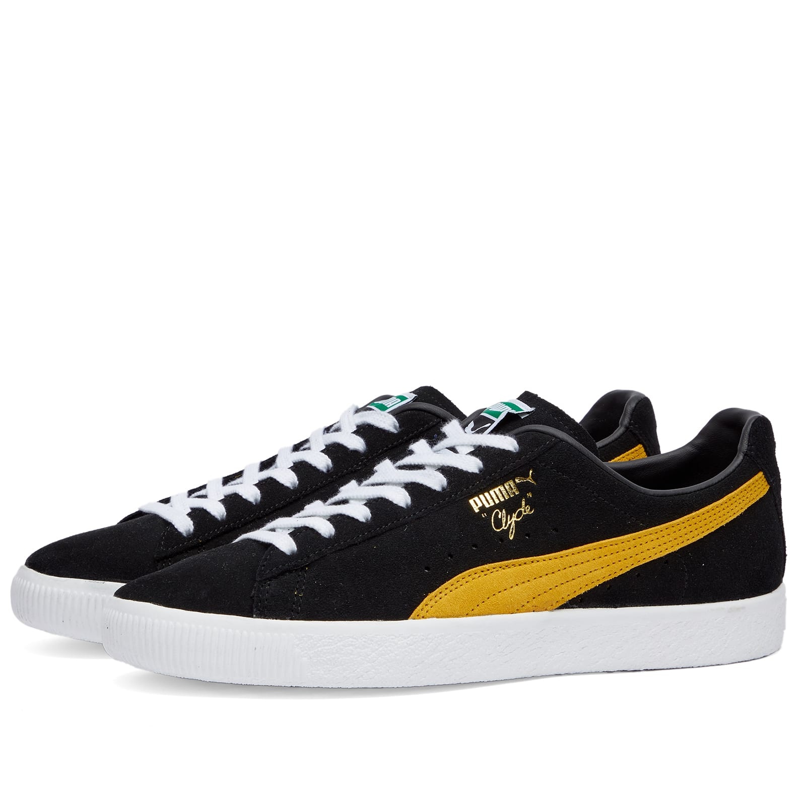 Taken straight from Puma’s iconic archives, these Clyde OG sneakers are a contemporary take on a classic style that was first released in the 70s. Made using a soft black suede upper, they’re accented with gold foil branding, and overlaid with a fresh “Yellow Sizzle” Formstrip. Just like its namesake, Walt “Clyde” Frazier, the Clyde embodies fashion, culture, and basketball heritage with confidence and flair. - Suede Upper - Leather Lining - Leather Overlay - Stitch Detailing - Rubber Outsole - Printed Branding