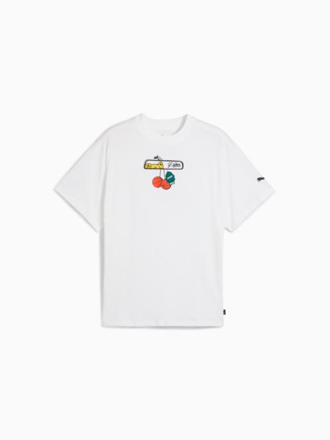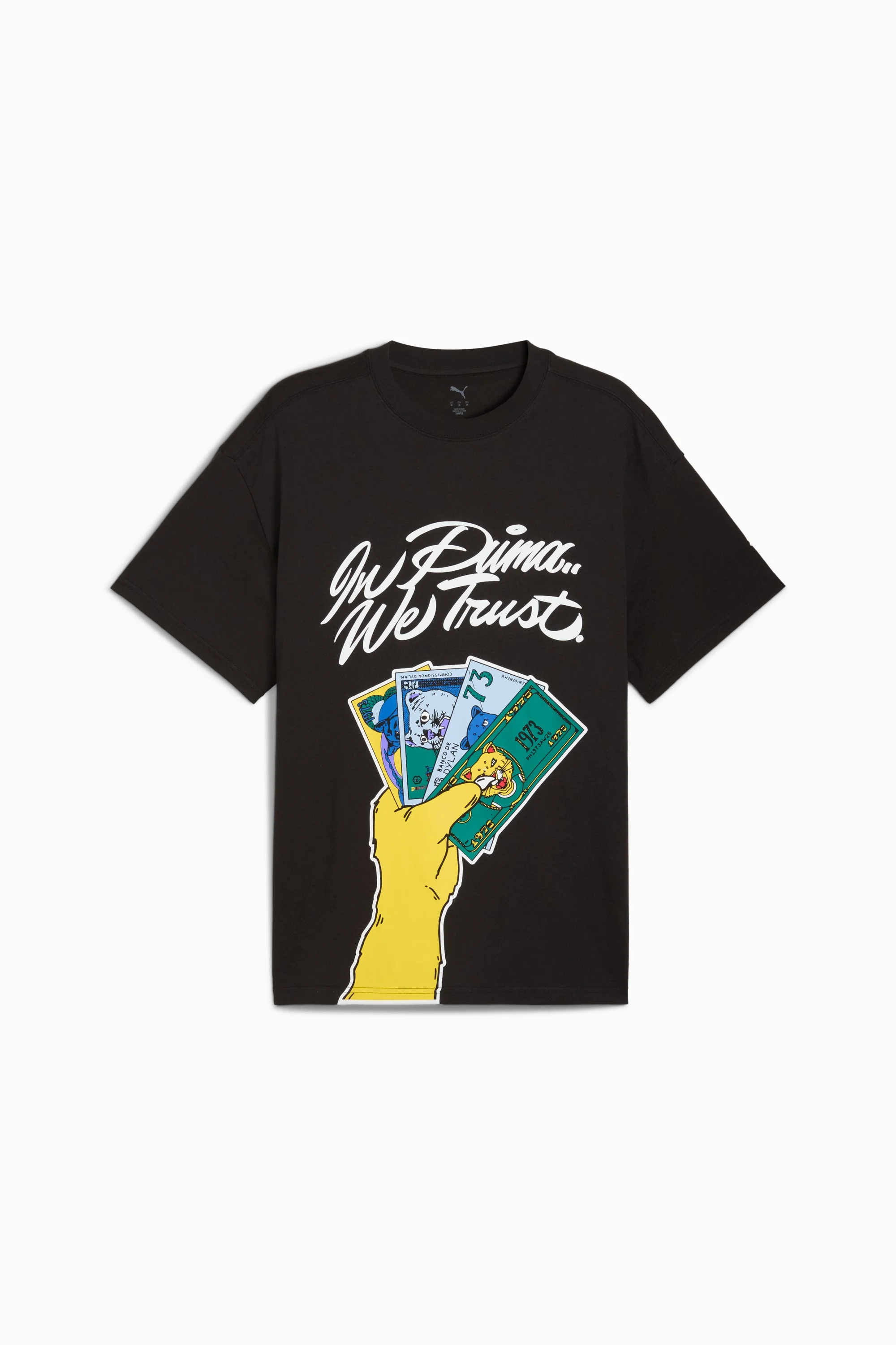 PRODUCT STORY Bring your A-game on and off the court with our basketball lifestyle pieces. Easy-to-wear essentials like hoodies, jerseys, tees, and sweatpants get a fresh update with bold graphics and details inspired by our love for the game. Whether it's warm-ups, post-game, or everyday wear, these pieces are designed to make a statement. FEATURES & BENEFITS - Made with at least 20% recycled cotton. DETAILS - Style: 632823_01 - Color: PUMA Black - Fit: Oversized - Main material: Single jersey - Neck: Crew neck - Short sleeves - Length: Regular MATERIAL INFORMATION - Shell: 100% cotton - Rib: 70% cotton, 30% polyester