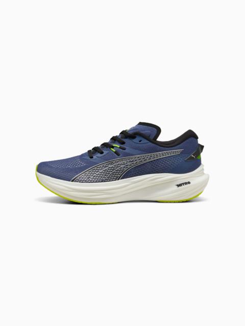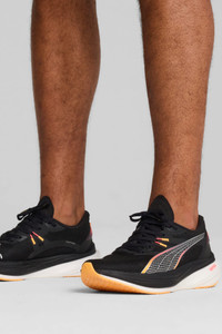 Experience unparalleled propulsion in your everyday training runs with the Deviate NITRO™ 3, featuring PWRPLATE technology and NITROFOAM™. This highly responsive trainer delivers a snappy ride, infusing speed into every stride. FEATURES & BENEFITS - The upper of the shoes is made with at least 20% recycled materials - NITROFOAM™: Advanced nitrogen-infused foam designed to provide superior responsiveness and cushioning in a lightweight package - PWRPLATE: Carbon fibre plate engineered to stabilise the midsole while maximising energy transfer DETAILS - Style: 309707_02 - Color: PUMA Black-Sun Stream - Regular fit - Engineered mesh upper - Stack height: 39mm/29mm - Weight: 250g (size UK8) - Heel-to-toe drop: 10mm - Recommended for: neutral pronators MATERIAL INFORMATION - Midsole: 100% Synthetic - Sockliner: 100% Textile - Outsole: 100% Rubber - Upper: 73% Textile, 27% Synthetic - Lining: 100% Textile