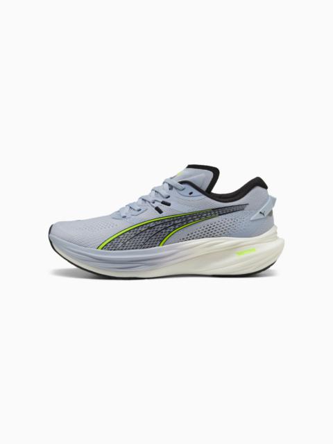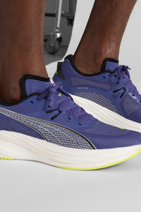 Optimized for a wide range of foot strikes and patterns, Deviate 3 is a super-fast, ultra-responsive running shoe for any runner. Engineered with the perfect combination of nitrogen-infused NITROFOAM™ for maximum energy return and PWRPLATE technology for responsiveness, the Deviate 3 provides best-in-class cushioning for a strong, snappy, and comfortable ride at any pace for any runner. Discover speed you didn’t even know you had with the Deviate 3 – and propel yourself to your next PB. FEATURES & BENEFITS - The upper of the shoes is made with at least 20% recycled materials - NITROFOAM™: Advanced nitrogen-infused foam designed to provide superior responsiveness and cushioning in a lightweight package - PWRPLATE: Carbon fibre plate engineered to stabilise the midsole while maximising energy transfer DETAILS - Style: 309707_17 - Color: Blue Crystal-PUMA Black - Regular fit - Engineered mesh upper - Stack height: 39mm/29mm - Weight: 250g (size UK8) - Heel-to-toe drop: 10mm - Recommended for: neutral pronators MATERIAL INFORMATION - Midsole: 100% Synthetic - Sockliner: 100% Textile - Outsole: 100% Rubber - Upper: 73% Textile, 27% Synthetic - Lining: 100% Textile