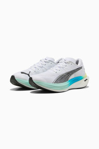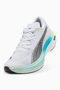 PRODUCT STORY Faster than ever, smoother than before, the Deviate 3 is a super-fast, explosive and ultra-responsive running shoe for training and racing. Built on the perfect combination of NITROFOAM™ - our innovative nitrogen infused foam offers maximum energy return - and PWRPLATE technology, the Deviate provides best in-class cushioning and responsiveness for a strong, snappy and comfortable ride at any pace for any runner. Optimized for a wide range of foot strikes and patterns and ready to propel you to your next PB. FEATURES & BENEFITS - The upper of the shoes is made with at least 20% recycled materials - NITROFOAM™: Advanced nitrogen-infused foam designed to provide superior responsiveness and cushioning in a lightweight package - PWRPLATE: Full-length Carbon Fiber plate engineered for race day to provide maximal propulsion, with extension beyond the toe to increase propulsion and step length stride after stride on race day. DETAILS - Style: 378449_07 - Color: PUMA White-Speed Blue - Wide fit - Engineered mesh upper - Stack height: 39mm/29mm - Weight: 250g (size UK8) - Heel-to-toe drop: 10mm - Recommended for: neutral pronators MATERIAL INFORMATION - Midsole: 100% Synthetic - Sockliner: 100% Textile - Outsole: 100% Rubber - Upper: 73% Textile, 27% Synthetic - Lining: 100% Textile