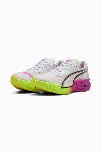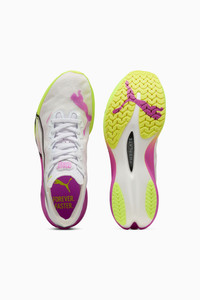 PRODUCT STORY Hit turbo speed. The Deviate NITRO™ Elite 3 is a running shoe redesigned for lightweight, race day propulsion. A carbon fibre PWRPLATE ensures stability and maximum running efficiency, while NITROFOAM™ ELITE offers supreme cushioning that won't weigh you down. It's a running go-to made with lightweight mono-mesh and durable PUMAGRIP rubber for multi-surface traction and an effortless run. FEATURES & BENEFITS - NITROFOAM™ ELITE: Premium performance foam technology that provides pinnacle responsiveness in an extremely lightweight package - PWRPLATE: Carbon fibre plate engineered to stabilise the midsole while maximising energy transfer - ULTRAWEAVE: Ultra-light, engineered fabric with a structured, 4-way stretch that reduces weight and friction. Built for athletes looking to increase speed and strength DETAILS - Style: 309809_05 - Color: PUMA White-Pure Magenta - Regular fit - ULTRAWEAVE upper - Stack height: 40mm/32mm - Weight: 194g (size UK8) - Heel-to-toe drop: 8mm - Recommended for: neutral pronators MATERIAL INFORMATION - Midsole: 100% Synthetic - Sockliner: 100% Textile - Outsole: 87% Rubber, 13% Synthetic - Upper: 82% Textile, 18% Synthetic - Lining: 100% Textile
