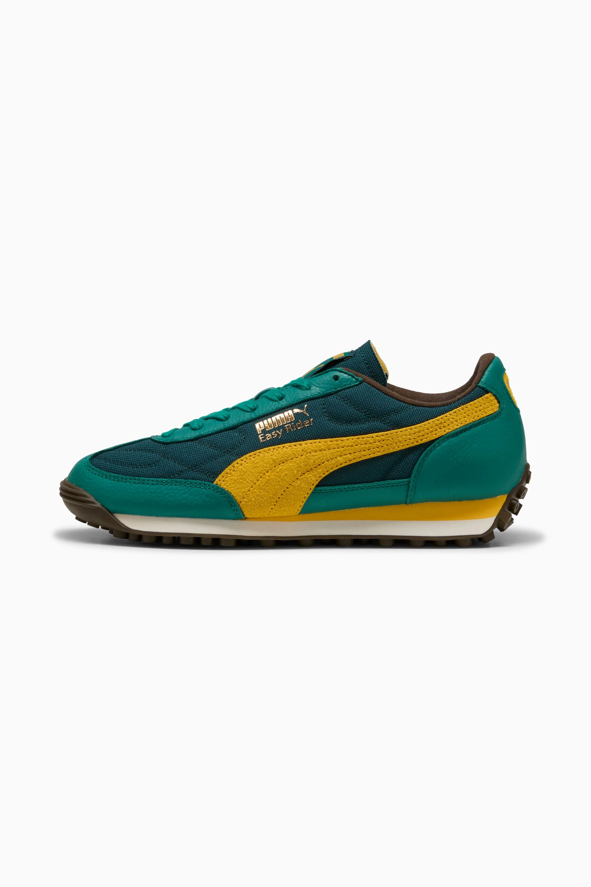 PRODUCT STORY Easy Rider was born in the late '70s, when running transitioned from the track to the streets. Today, the retro runner returns to the streetwear scene, featuring its classic slim profile and vintage vibes. This timeless silhouette is now available in nostalgic colors with an updated midsole. FEATURES & BENEFITS - PROFOAM: Lightweight EVA designed to cushion your landing and propel your next step DETAILS - Style: 403176_02 - Color: Green Terrain-Yellow Sizzle - Width: Regular - Toe Type: Rounded - Fastener: Laces - Main material of upper: Textile with leather details - Heel type: Flat - Lining: Canvas - Comfortable EVA midsole - Rubber outsole MATERIAL INFORMATION - Midsole: 100% Synthetic - Sockliner: 100% Synthetic - Outsole: 100% Rubber - Upper: 68% Leather - cow, 32% Textile - Lining: 52% Textile, 48% Synthetic