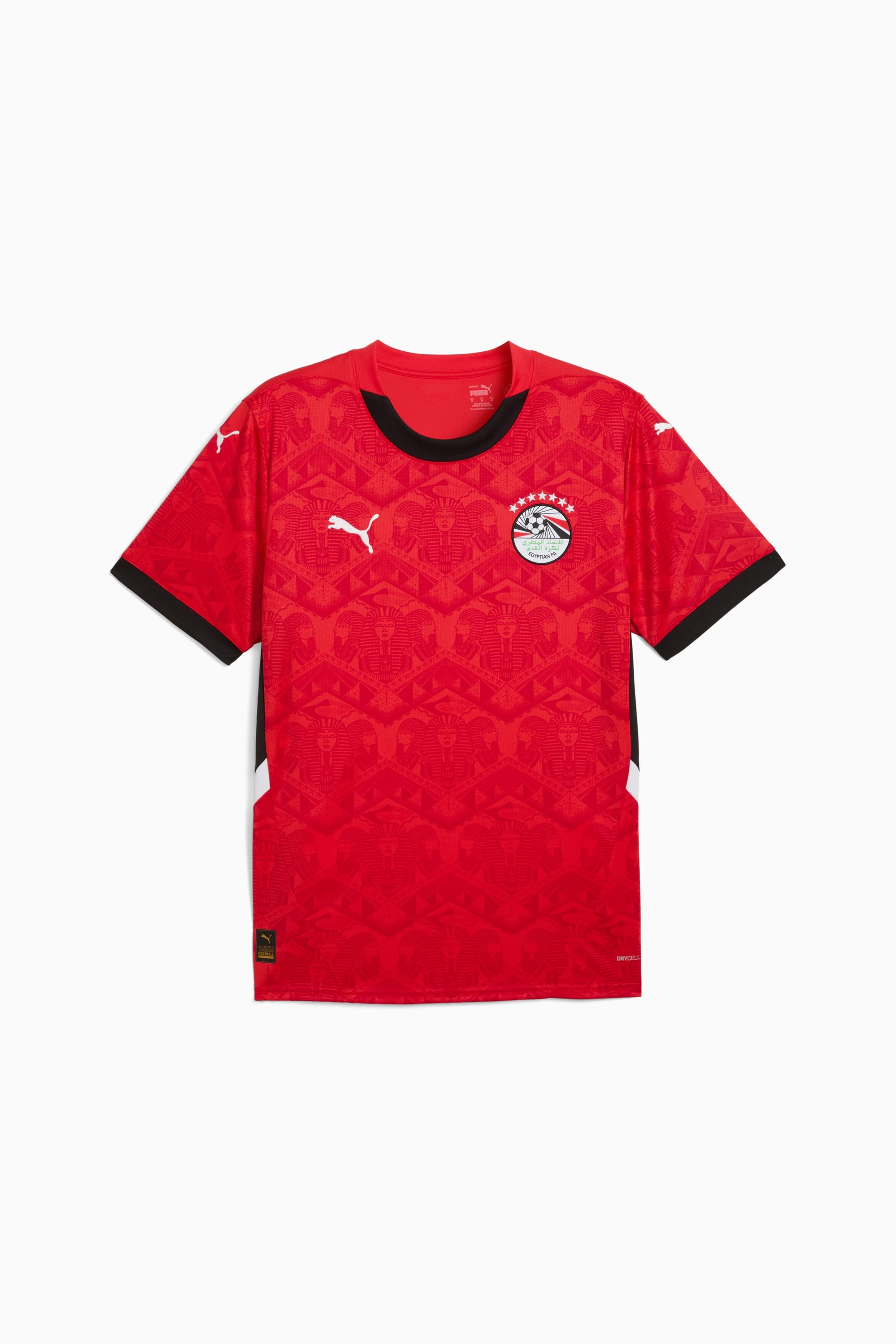 PRODUCT STORY Step into soccer royalty with the Egypt Home Kit. Featuring motifs of sphinx, pyramids, and sand dunes throughout a sleek tonal print on classic red, this kit will have you ruling the game like a true Pharaoh. FEATURES & BENEFITS - As part of the RE:FIBRE program, this garment is made of at least 95% recycled material from textile waste and other used materials - dryCELL: Performance technology designed to wick moisture from the body and keep you free of sweat during exercise DETAILS - Style: 777132_01 - Color: PUMA Red-PUMA Black - Regular fit - Short sleeves - Regular length - Mesh curved side panels and inserts - Egypt badge, sponsor logo, and PUMA cat logo - PUMA branding details MATERIAL INFORMATION - Shell: 100% polyester - Rib: 100% polyester