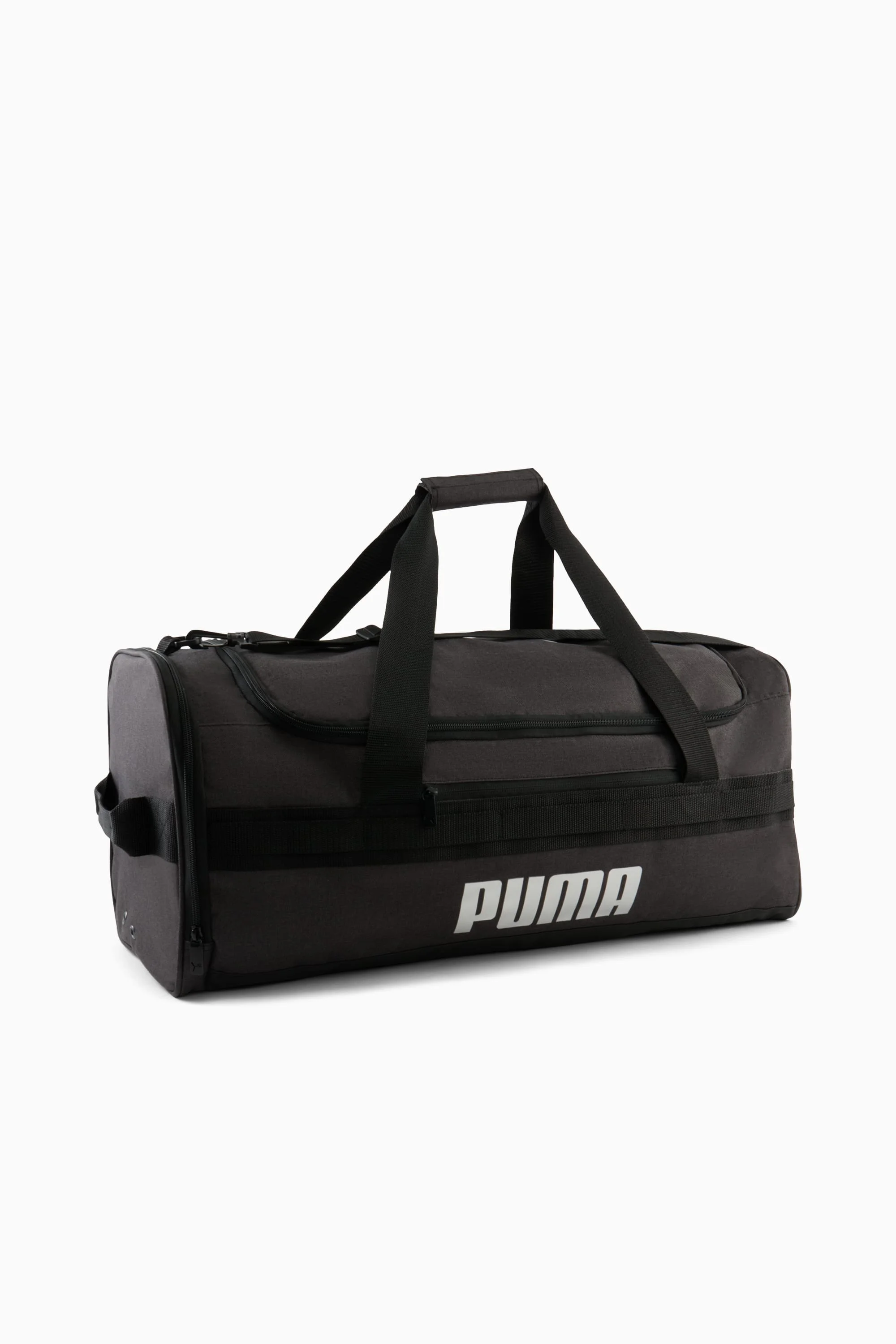 PRODUCT STORY Get out of here. This duffle bag is perfect for all your carrying needs. It's sturdy, simple, and has plenty of storage for everythig you may take with you. There's no better way to get where you're going. DETAILS - Style: 859228_02 - Color: BLACK TRADITIONAL - Two handles at top - One handle at side - Comes with cross body strap - Mesh pocket at side - Zipper pocket on inside - Zipper pocket on outside side - PUMA Cat logo at side - PUMA wordmark on side - Dimensions: 11.75" x 25" x 12" - 100% polyester