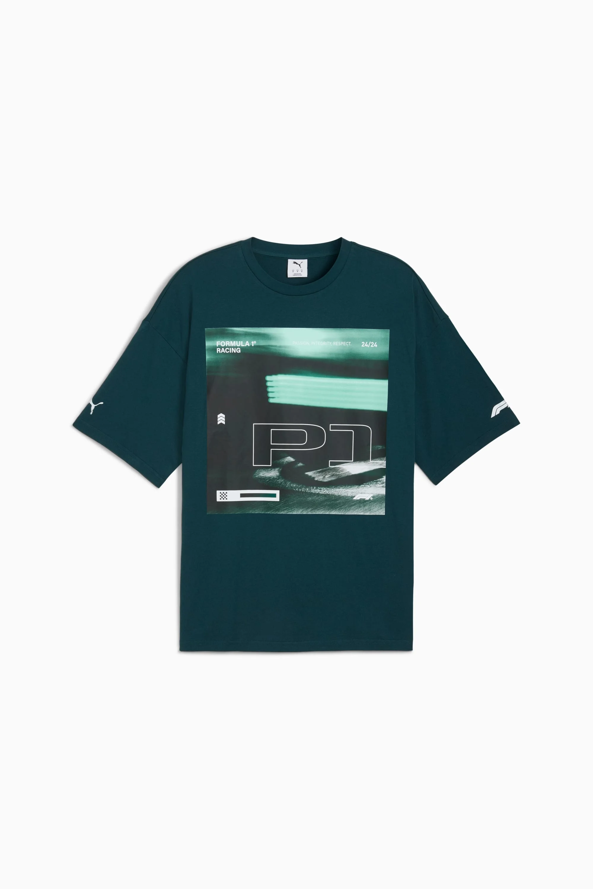 PRODUCT STORY A milestone worth the noise: Formula 1® turns 75. And because legends never slow down, PUMA and FORMULA 1® are celebrating the high-octane journey with a collection that knows how to keep up. 75 years on, faster has never looked better. Race on. FEATURES & BENEFITS - Made with at least 20% recycled cotton. DETAILS - Style: 632992_04 - Color: Green Terrain - Relaxed fit - Single jersey material - Short sleeves - Crew neck - Regular length - Graphic detail on the front MATERIAL INFORMATION - Shell: 100% cotton - Rib: 71% cotton, 29% polyester