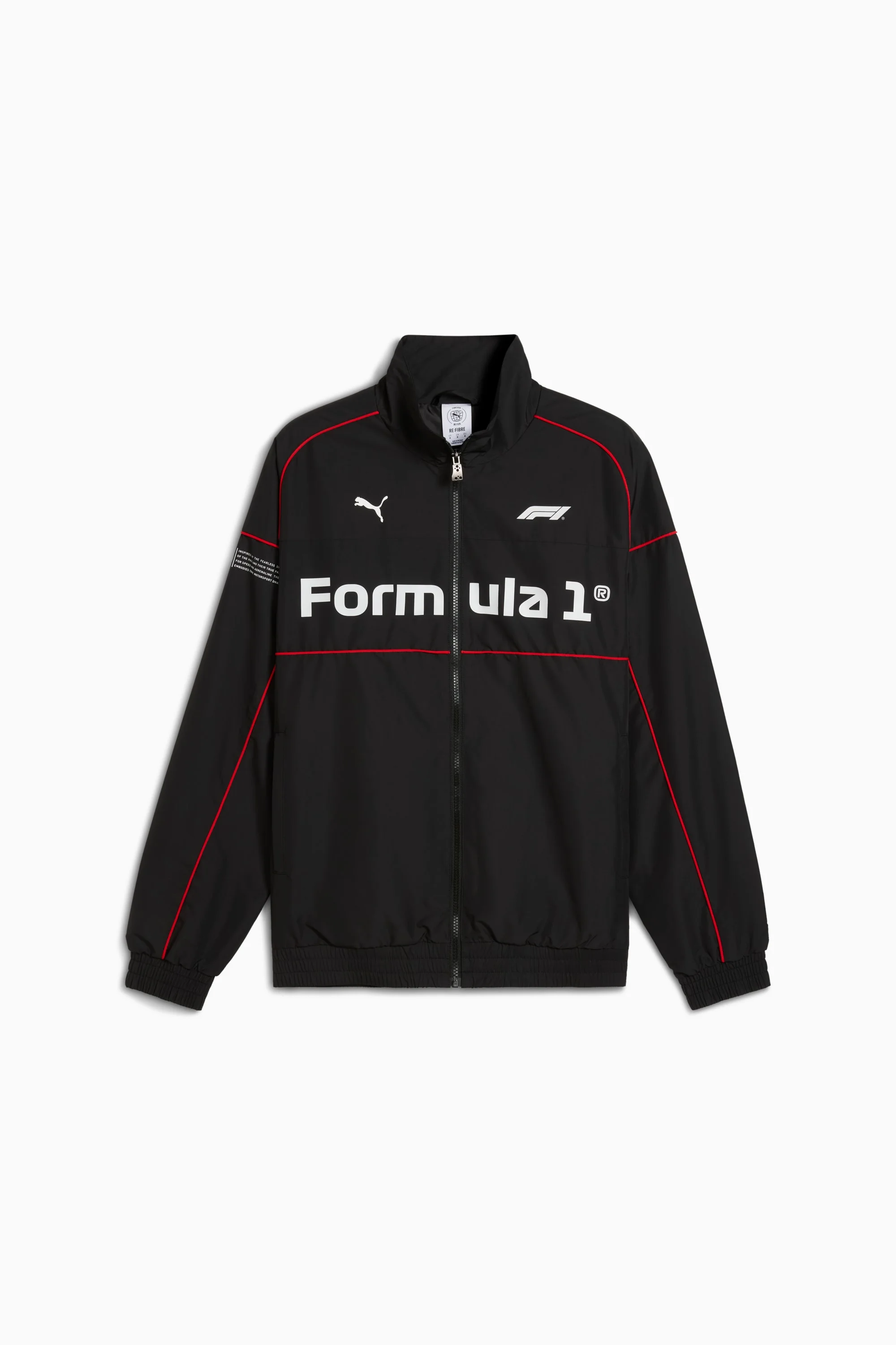 PRODUCT STORY A milestone worth the noise: Formula 1® turns 75. And because legends never slow down, PUMA and FORMULA 1® are celebrating the high-octane journey with a collection that knows how to keep up. 75 years on, faster has never looked better. Race on. FEATURES & BENEFITS - As part of the RE:FIBRE program, this garment is made of at least 95% recycled material from textile waste and other used materials. DETAILS - Style: 633153_01 - Color: PUMA Black - Regular fit - Main material type: Ripstop - Long sleeves - Full-zip closure - Stand up collar - Zipped pockets MATERIAL INFORMATION - Upper Pocket Bag: 100% polyester - Lining: 100% polyester - Trimming: 58% nylon, 36% polyester, 6% elastane - Shell: 100% polyester - Lower Pocket Bag: 100% polyester - Pocket Bag: 100% polyester