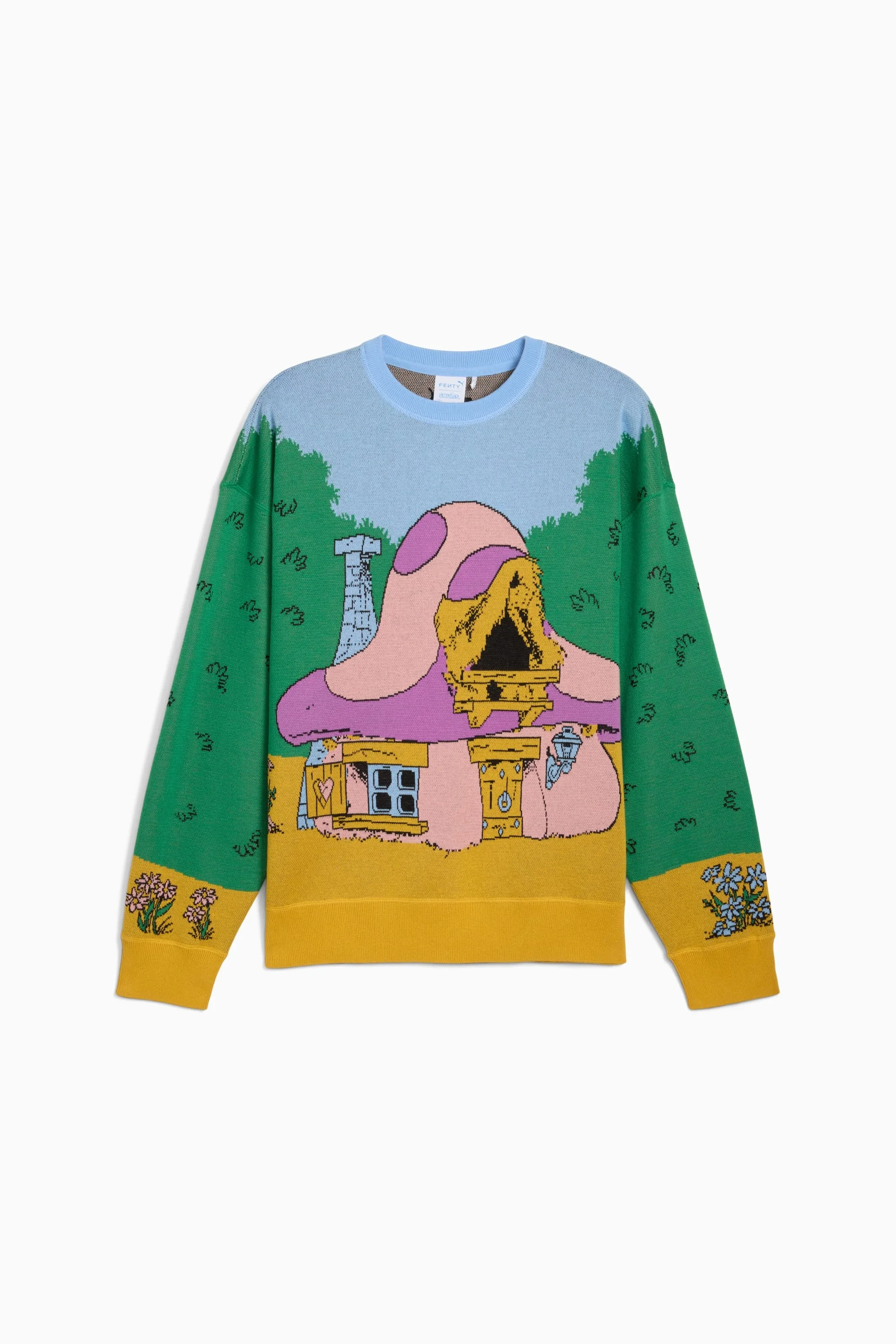 PRODUCT STORY Welcome to the world of FENTY x PUMA x SMURFS. This new collection is inspired by the upcoming movie *Smurfs*, featuring Rihanna as the iconic Smurfette, only in theaters July 18. This collection, designed for both adults and kids, includes knits showcasing the Smurf Village, an all-over print of the Smurfs on their Parisian adventure, multiple custom collaboration logos, and a new version of the Avanti sneakers. Here, it's all about the little things. FEATURES & BENEFITS - Made with at least 30% recycled materials. DETAILS - Style: 633454_01 - Color: Day Dream - Fit: Oversized - Main material type: Sweater - Crew neck - Long sleeves - Apparel Length: Regular - Graphic print of Smurfette's mushroom house MATERIAL INFORMATION - Shell: 60% cotton, 40% polyester - Collar: 53% cotton, 35% polyester, 10% nylon, 2% elastane - Top Hem: 58% cotton, 38% polyester, 3% nylon, 1% elastane - Sleeve Cuff: 58% cotton, 38% polyester, 3% nylon, 1% elastane