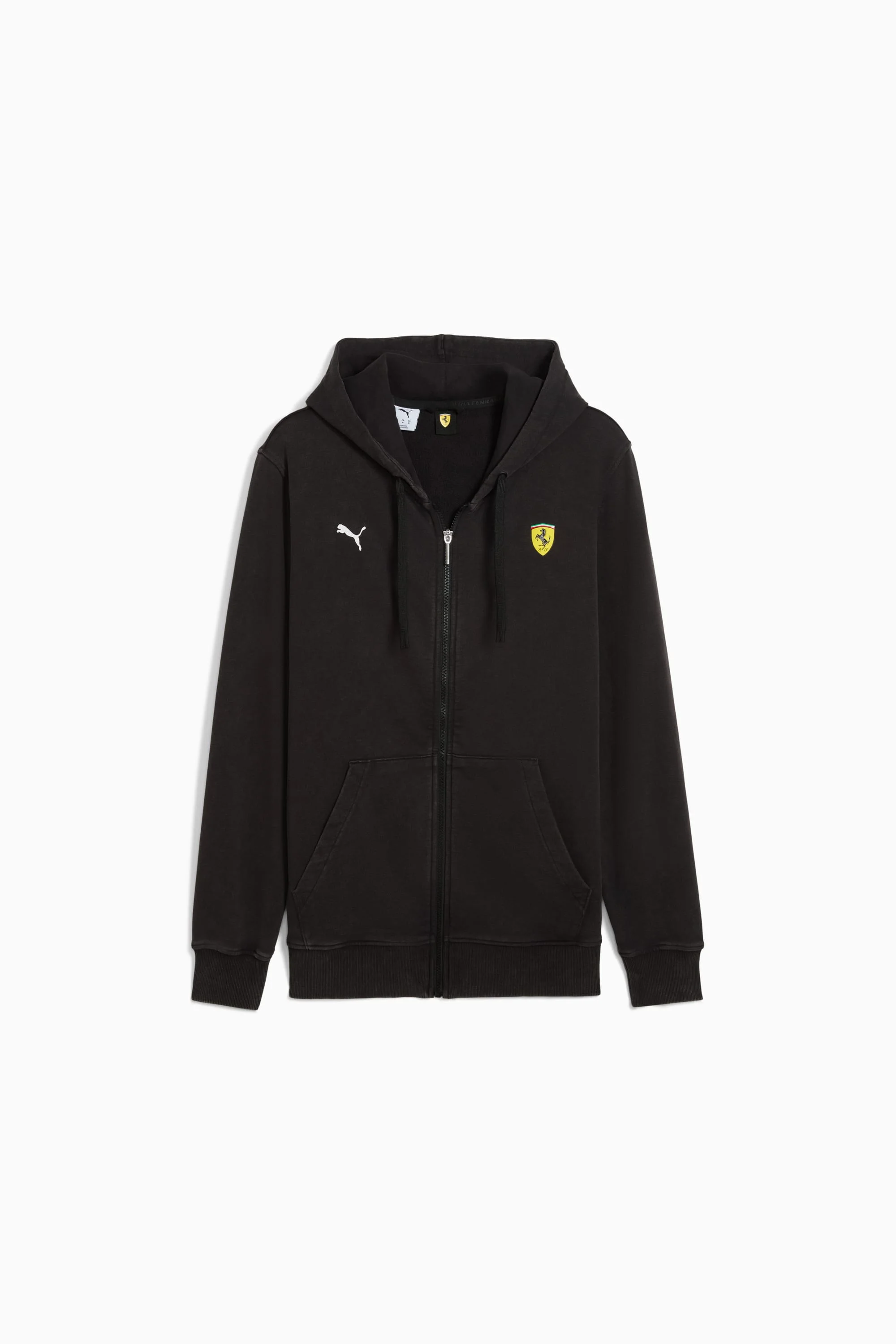 PRODUCT STORY The PUMA and Scuderia Ferrari collection celebrates motorsport excellence and Ferrari's legendary racing heritage. This line of shoes, clothing, and accessories blends style, comfort, and performance with iconic Scuderia Ferrari colors and details, letting you carry the Ferrari legacy wherever you go. FEATURES & BENEFITS - Made with at least 20% recycled cotton. DETAILS - Style: 632776_01 - Color: PUMA Black - Fit: Relaxed - Main material: French Terry - Lined hood with drawcord - Long sleeves - Fastener: Full zip - Length: Regular - Ribbed hem and cuffs - Pockets: Zip Pocket MATERIAL INFORMATION - Shell: 100% cotton - Rib: 97% cotton, 3% elastane