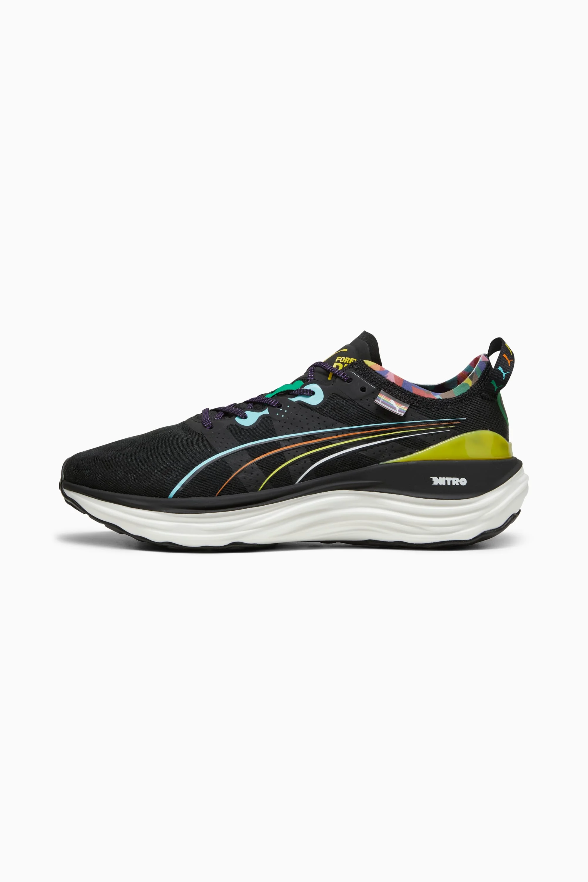 PRODUCT STORY Run proud with the LOVE MARATHON ForeverRun Nitro™. Perfect for all runners and especially beginners, this shoe packs the tried-and-true RUNGUIDE system, designed to keep your feet running in the right position. We've combined a secure engineered mesh upper with an asymmetrical heel counter, to give you softness, comfort and stability. Lace up and start your running adventure with confidence. FEATURES & BENEFITS - NITRO™: Our innovative Nitrogen-infused foam technology is lightweight and provides explosive energy stride after stride. - PUMAGRIP Outsole: Durable rubber compound that provides best-in-class multi-surface traction. DETAILS - Style: 380099_02 - Color: PUMA Black-PUMA White - Engineered mesh upper - TPU heel clip and wide midsole geometry for stability - 10mm heel-to-toe drop - Recommended for: road running - Mileage/Lifespan: 800km - Pronation level: Overpronator - PUMA Formstrip on lateral side - Shoe weight: 272g (for size UK 8) MATERIAL INFORMATION - Midsole: 100% Synthetic - Sockliner: 100% Textile - Outsole: 100% Rubber - Upper: 63% Textile, 37% Synthetic - Lining: 100% Textile