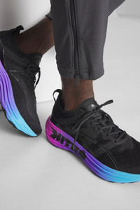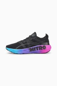PRODUCT STORY The ForeverRun NITRO™ dawns a new era of support and guidance for all runners, providing the softness of a full NITROFOAM™ midsole without compromising stability. It features a newly developed NITROFOAM™ midsole with two different densities – a softer core with a firmer rim – and an asymmetrical heel counter to hold the foot in place through every stride. The theme also continues on the outsole, thanks to a wider medial rubber segment stabilising late-stage pronation. In short, it's the perfect blend of support and cushion. FEATURES & BENEFITS - NITROFOAM™: Advanced nitrogen-injected foam designed to provide superior responsiveness and cushioning in a lightweight package - PWRTAPE: Targeted upper reinforcement for support and durability - PUMAGRIP: Durable performance rubber compound designed for all-surface traction - RUNGUIDE: Firm density guide rail designed to keep your foot aligned and centred through each stride DETAILS - Style: 380007_01 - Color: PUMA Black-Luminous Blue-Electric Orchid - Low boot - Engineered mesh upper for support - PWRTAPE reinforcement for upper - Asymmetrical heel counter stabilises the foot at impact and early pronation - NITROFOAM™ midsole - RUNGUIDE system promotes proper alignment and keeps the foot centred through each stride - PUMAGRIP rubber outsole - Medial flare for wider foot support MATERIAL INFORMATION - Midsole: 100% Synthetic - Sockliner: 100% Textile - Outsole: 100% Rubber - Upper: 63% Textile, 37% Synthetic - Lining: 100% Textile