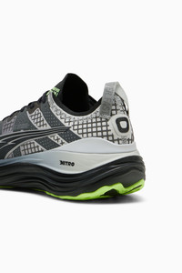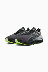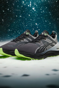 PRODUCT STORY FOREVERRUN NITRO™ ushers in a new era of stability, blending responsive NITROFOAM™ cushioning with enhanced support from the RUNGUIDE SYSTEM. The upper is water repellent and reflective, keeping you warm, dry, and seen in the dark months of winter. Run Forever in FOREVERRUN. FEATURES & BENEFITS - RUNGUIDE SYSTEM: Firm density guide rail designed to keep your foot aligned and centred through each stride - DUAL DENSITY NITROFOAM™ CUSHIONING: A soft internal layer of our innovative Nitrogen-infused foam technology provides cushioning while a firmer layer surrounding the shoe provides stability where you need it to support your stride DETAILS - Style: 310077_01 - Color: PUMA Black-Glacial Gray-Fizzy Apple - Regular fit - Water-repellent mesh upper - Stack height: 36mm/26mm - Weight: 272g (UK8) - Heel-to-toe drop: 10mm - Recommended for: overpronators MATERIAL INFORMATION - Midsole: 100% Synthetic - Sockliner: 100% Textile - Outsole: 100% Rubber - Upper: 59% Textile, 41% Synthetic - Lining: 100% Textile