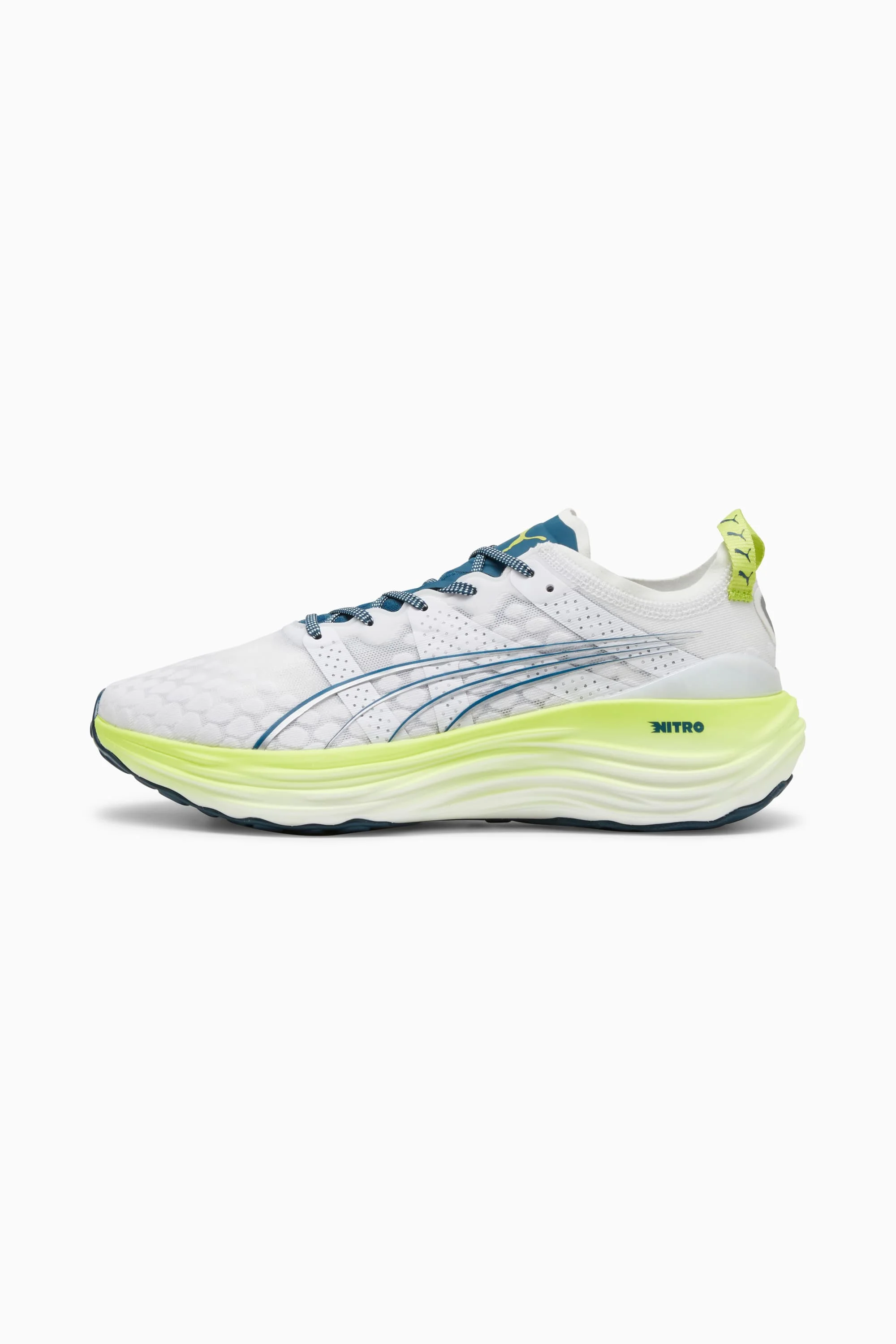 PRODUCT STORY The ForeverRUN NITRO™ dawns a new era of support and guidance for all runners, providing the softness of a full NITROFOAM™ midsole without compromising stability. It features the newly developed NITROFOAM™ midsole with two different densities – a softer core with a firmer rim – and an asymmetrical heel counter to hold the foot in place through every stride. The theme also continues on the outsole, thanks to a wider medial rubber segment stabilising late-stage pronation. In short, it's the perfect blend of support and cushion. FEATURES & BENEFITS - NITRO™: Advanced nitrogen-infused foam designed to provide superior responsiveness and cushioning in a lightweight package - PWRTAPE: Targeted upper reinforcement for support and durability - RUNGUIDE: Firm density guide rail designed to keep your foot aligned and centred through each stride - PUMAGRIP: Durable performance rubber compound designed for all-surface traction DETAILS - Style: 377757_19 - Color: PUMA White-Ocean Tropic-Lime Pow - Engineered mesh upper - Asymmetrical heel counter - Flared rubber outsole - Cushioning level: Max - Heel-to-toe drop: 10mm - Best for: Overpronators - Runner type: Frequent MATERIAL INFORMATION - Midsole: 100% Synthetic - Sockliner: 100% Textile - Outsole: 100% Rubber - Upper: 63% Textile, 37% Synthetic - Lining: 100% Textile