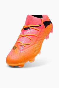 PRODUCT STORY PUMA has always challenged tradition, reinventing ways to express yourself and stand out on the pitch. Make your own statement with the new Tricks Pack, featuring FUTURE 7 ULTIMATE in signature mismatched colors. These cleats feature a re-engineered upper which combines PWRPRINT and PWRTAPE with extra stretchy knit and soft dual mesh for a next-generation adaptive fit. FEATURES & BENEFITS - FUZIONFIT360: combines engineered dual mesh, extra stretchy knit, PWRPRINT, and 2 layers of PWRTAPE for a snug, supportive fit and absolute freedom of movement - PWRTAPE: Targeted upper reinforcement for support and durability - Dynamic Motion System: this super lightweight outsole is designed to provide freedom of movement and enhanced multidirectional traction thanks to its advanced stud configuration - The upper of this shoe is made with at least 20% recycled materials DETAILS - Style: 108070_01 - Color: Sunset Glow-Sun Stream-PUMA Black-PUMA White - FUZIONFIT360 upper with PWRPRINT and PWRTAPE: for freedom of movement and a snug, supportive fit - 3D grip textures at key contact zones for the ultimate touch and control - Lightweight removable sockliner with NanoGrip technology keeps the foot from slipping inside the boot - Micro-perforated heel padding keeps the heel locked in and comfortable - Dynamic Motion System outsole - Regular to wide fit - Mid-cut slip-on construction which can be worn with or without laces - FG/AG: Suitable for use on both firm natural surfaces and artificial grass (4G) MATERIAL INFORMATION - Sockliner: 100% Textile - Outsole: 100% Synthetic - Upper: 79.13% Synthetic, 20.87% Textile - Lining: 100% Synthetic