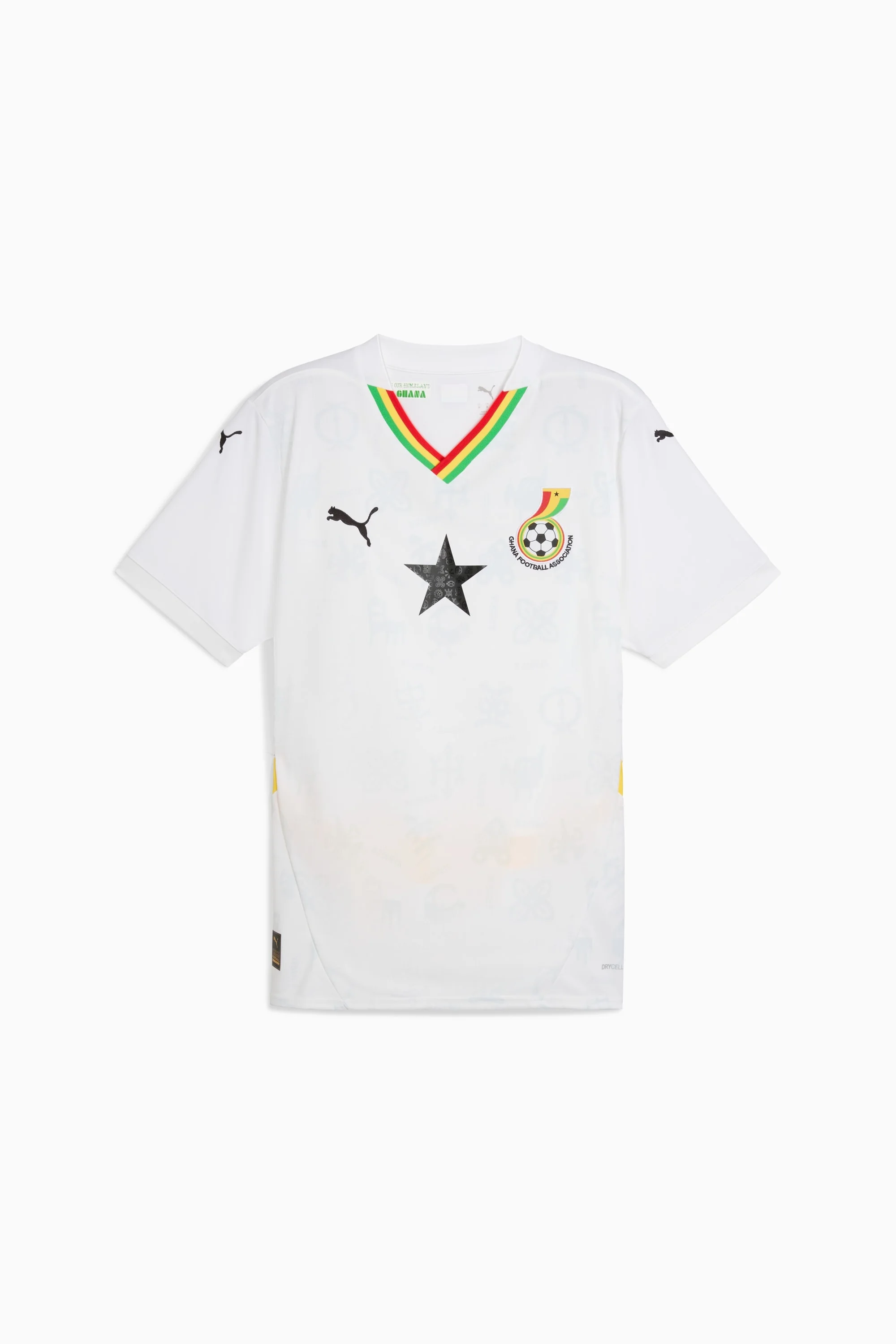 PRODUCT STORY Show your pride for the Black Stars with the Ghana Home Kit. Traditional Adinkra symbols create a distinctive all-over pattern, honoring the richness of Ghana's cultural heritage. The Black Star at the center adds the perfect finishing touch. FEATURES & BENEFITS - As part of the RE:FIBRE program, this garment is made of at least 95% recycled material from textile waste and other used materials - dryCELL: Performance technology designed to wick moisture from the body and keep you free of sweat during exercise DETAILS - Style: 777192_01 - Color: PUMA White-Pele Yellow - Regular fit - Short sleeves - Regular length - Ghana badge - PUMA branding details MATERIAL INFORMATION - Shell: 100% polyester - Collar: 97% polyester, 3% elastane - Rib: 100% polyester