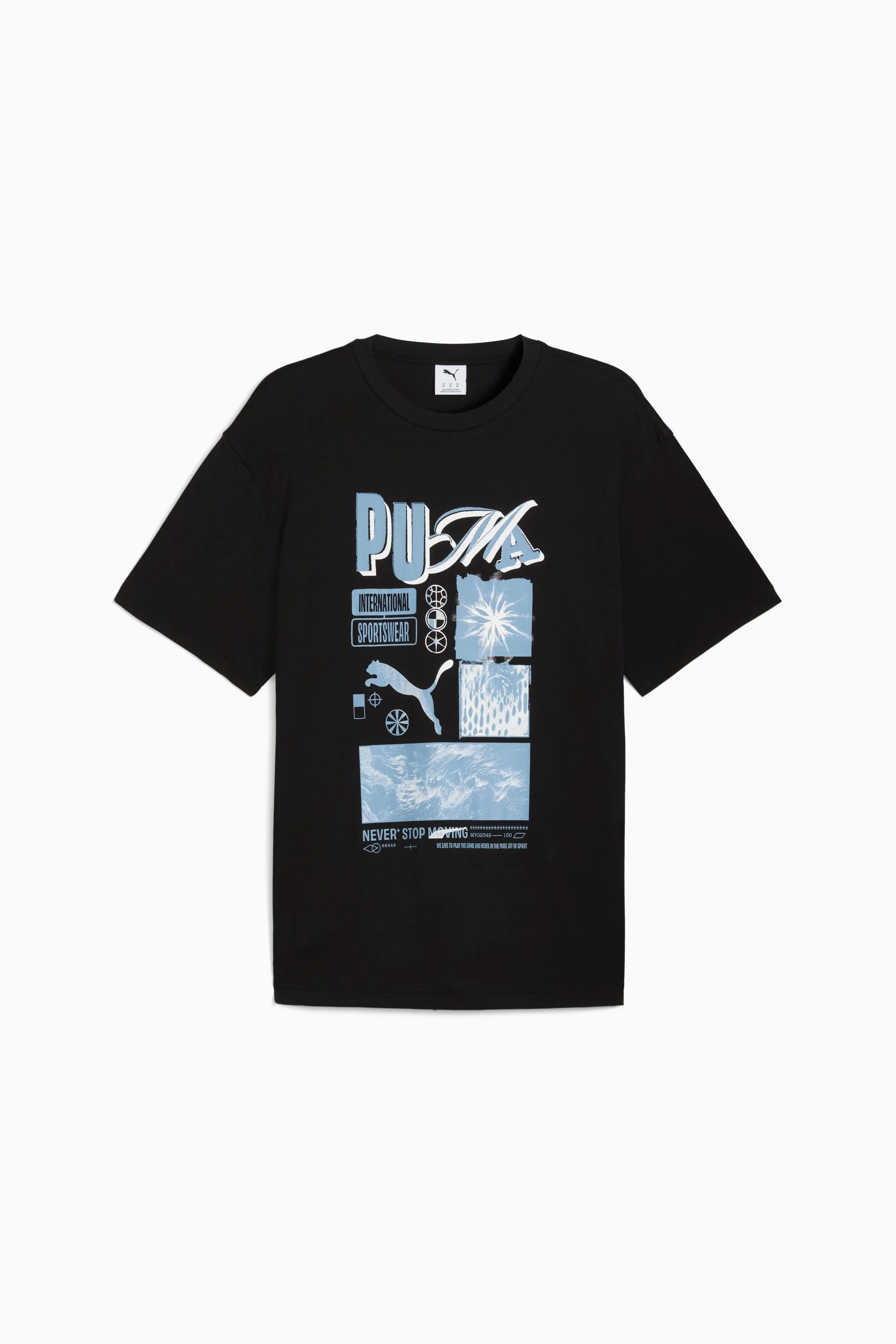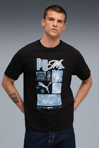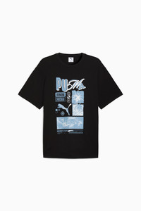 PRODUCT STORY PUMA's collection of graphic tees blends creative graphics with simple style, creating comfortable pieces that make a statement. From abstract patterns to iconic logos, each design adds a unique twist. No matter where your day takes you, these graphics enhance your look with effortless cool. FEATURES & BENEFITS - Made with at least 20% recycled cotton. DETAILS - Style: 632116_01 - Color: PUMA Black - Fit: Relaxed - Main material: Single jersey - Neck: Crew neck - Short sleeves - Length: Regular