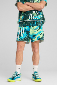 PRODUCT STORY Showcase your basketball-inspired style with these relaxed fit shorts. Featuring PUMA basketball branding and crafted from soft French Terry, they offer a laid-back vibe perfect for any occasion. Make every moment count, whether you're on the court or hanging out with friends. FEATURES & BENEFITS - Made with at least 20% recycled cotton. DETAILS - Style: 630505_01 - Color: Dark Myrtle-Spring Fern-AOP - Relaxed fit - Main material: French Terry - Short length - Medium rise - PUMA branding details MATERIAL INFORMATION - Upper Pocket Bag: 100% cotton - Shell: 100% cotton