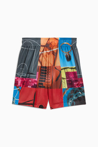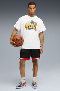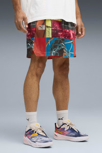 PRODUCT STORY Bring your A-game on and off the court with our basketball lifestyle pieces. Easy-to-wear essentials like hoodies, jerseys, tees, and sweatpants are updated with bold graphics and details inspired by our love for the game. Whether it's warm-ups, post-game, or everyday wear, these pieces are here to make a statement. FEATURES & BENEFITS - 100% polyester, mesh material. DETAILS - Style: 632871_01 - Color: PUMA Black-CMYK-AOP - Fit: Relaxed - Main material: Mesh - Waistband with drawcords - Length: Above-knee length - Rise: Medium - Pockets: Side pockets MATERIAL INFORMATION - Inner Shell: 100% polyester - Pocket Bag: 100% polyester