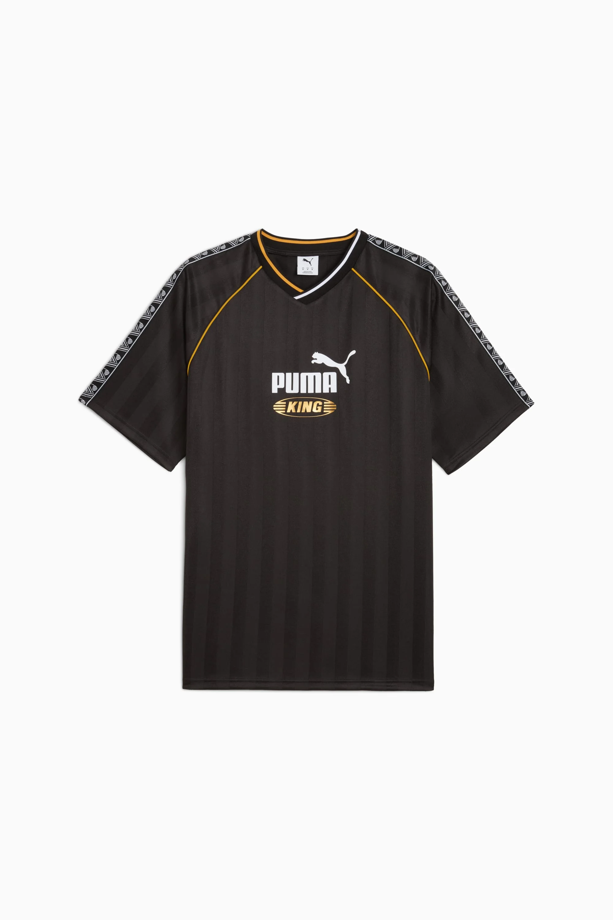 PRODUCT STORY We're bringing it back with a collection of apparel centered around a soccer icon: The King Indoor. In the early '00s, this shoe represented youth style culture, and now we're reintroducing it to inspire the next generation. This collection of archive-inspired pieces proudly features the KING logo front and center. FEATURES & BENEFITS - dryCELL: Performance technology designed to wick moisture from the body and keep you free of sweat during exercise - Made with at least 90% recycled materials. DETAILS - Style: 632563_01 - Color: PUMA Black - Fit: Relaxed - Main material: Pique - Short sleeves - Neck: V-Neck - Length: Regular - All-over print - Graphic tape on the sleeves MATERIAL INFORMATION - Shell: 100% polyester - Rib: 97% polyester, 3% elastane