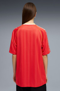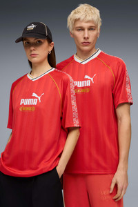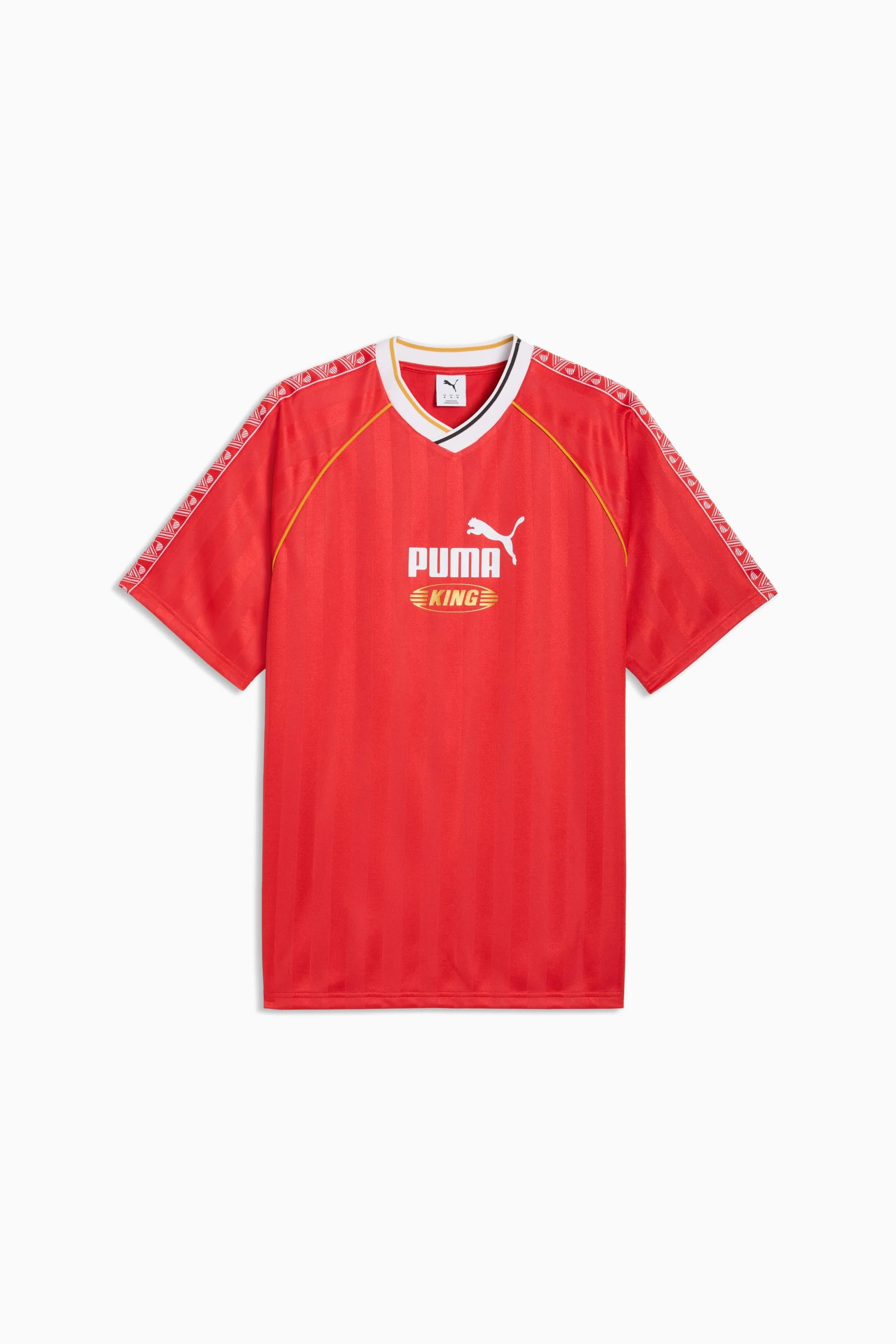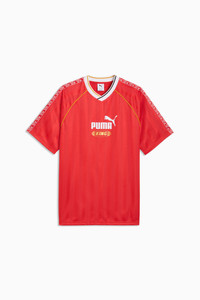 PRODUCT STORY We're bringing it back with a collection of apparel centered around a soccer icon: The King Indoor. In the early '00s, this shoe represented youth style culture, and now we're reintroducing it to inspire the next generation. This collection of archive-inspired pieces proudly features the KING logo front and center. FEATURES & BENEFITS - dryCELL: Performance technology designed to wick moisture from the body and keep you free of sweat during exercise - Made with at least 90% recycled materials. DETAILS - Style: 632563_11 - Color: For All Time Red - Fit: Relaxed - Main material: Pique - Short sleeves - Neck: V-Neck - Length: Regular - All-over print - Graphic tape on the sleeves MATERIAL INFORMATION - Shell: 100% polyester - Rib: 95% polyester, 5% elastane