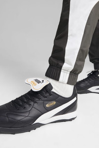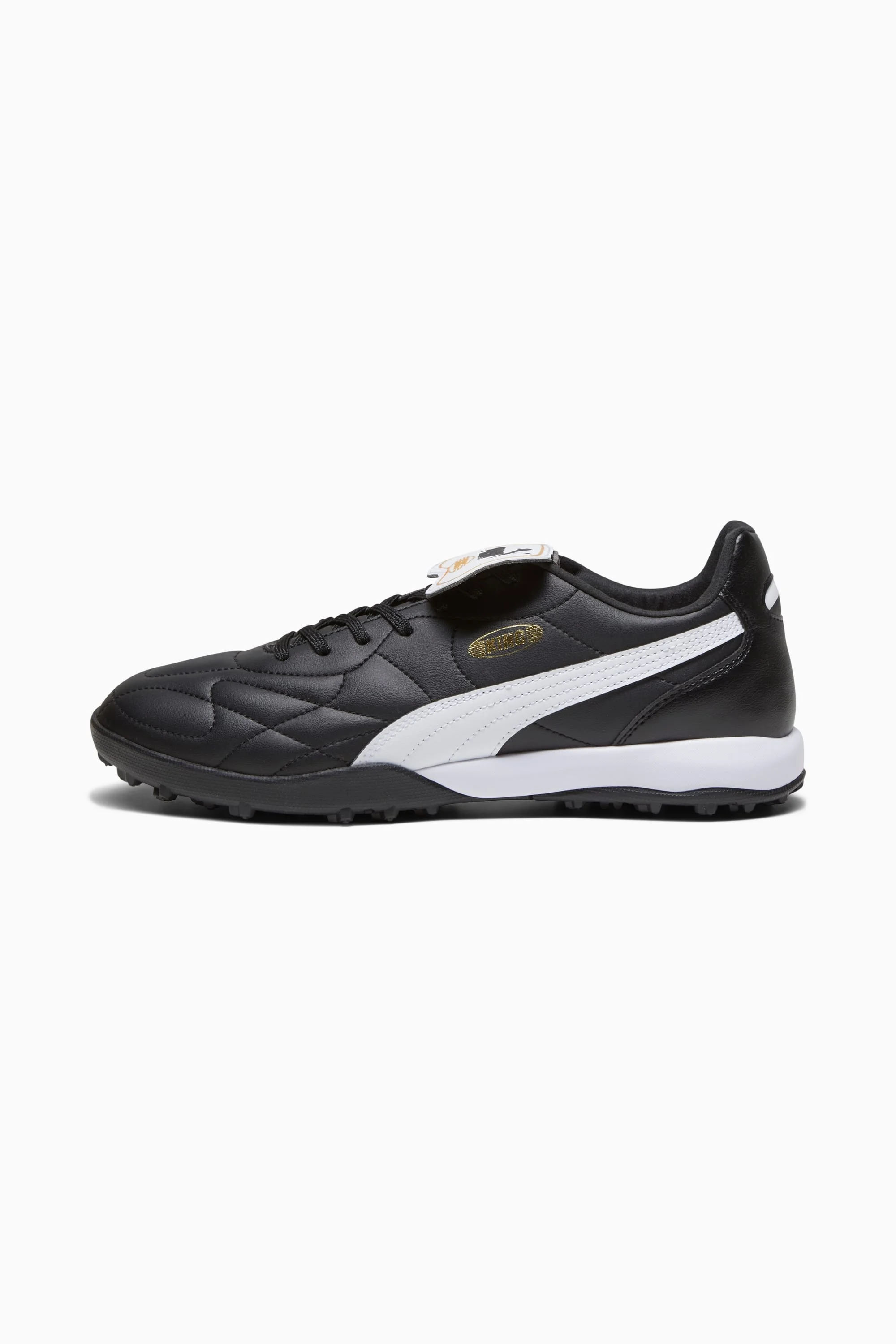 PRODUCT STORY Tradition and innovation – that’s classic KING. The retro-inspired KING TOP combines classic KING elements, such as the fold-over tongue and deco stitching, with a completely re-engineered lightweight outsole and a new, 60% recycled K-BETTER material for the upper. Retro KING branding adds the finishing touch. FEATURES & BENEFITS - The upper of this shoe is made with at least 20% recycled materials as a step toward a better future. - K-BETTER™: This new, non-animal based upper material takes the signature touch, comfort, and stretch resistance to the next level. The signature KING touch. Only better. DETAILS - Style: 107417_01 - Color: PUMA Black-PUMA White-PUMA Gold - Synthetic upper - Iconic fold-over tongue - Low-profile multi-studded rubber outsole. Suitable for use on hard natural surfaces and artificial grass (2G). - TT: Turf Training MATERIAL INFORMATION - Midsole: 100% Synthetic - Sockliner: 100% Textile - Outsole: 100% Rubber - Upper: 100% Synthetic - Lining: 100% Synthetic