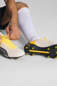 PRODUCT STORY For the new generation of KING, we took everything we know about ball control and made it even better. Reengineered for next level performance, these men's soccer cleats feature a comfortable and stretchy upper for improved touch and a lightweight outsole with conical studs for superior traction. Responsive and agile, you'll take your game to the next level. FEATURES & BENEFITS - Recycled Content: The upper of this shoe is made with at least 20% recycled materials as a step toward a better future DETAILS - Style: 107563_05 - Color: Alpine Snow-Asphalt-Yellow Blaze - Knitted low-cut slip-on construction ensures a comfortable fit - K-BETTER upper made with 60% recycled nylon from post-industrial waste - Lightweight outsole with external heel counter, integrated stability spine, and conical studs for maximum manoeuvrability MATERIAL INFORMATION - Sockliner: 100% Textile - Outsole: 100% Synthetic - Upper: 100% Synthetic - Lining: 100% Synthetic