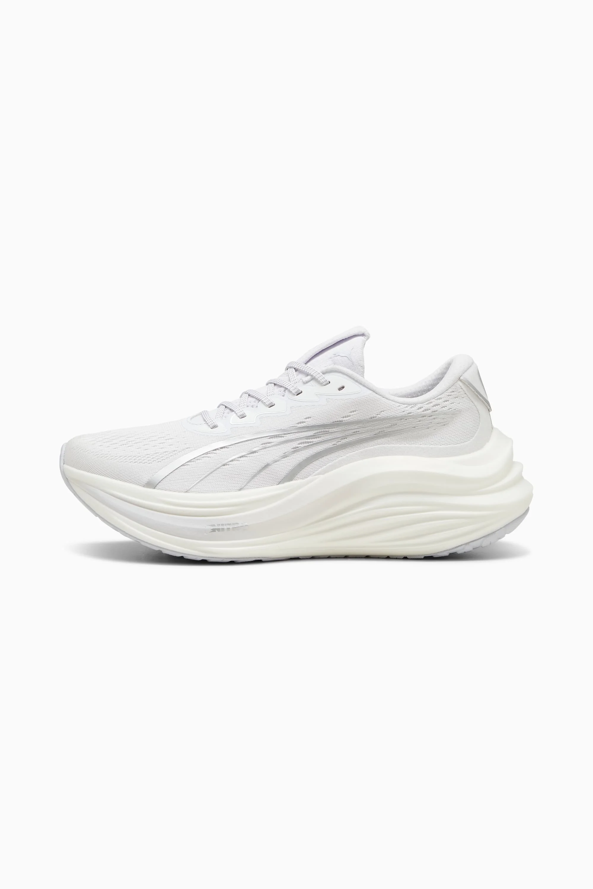 PRODUCT STORY Experience an exhilarating bounce like never before with the MagMax NITRO™. Boasting an impressive amount of cutting-edge NITROFOAM™ technology, these shoes will effortlessly propel you from one mile to the next, filling your stride with excitement and ease. Around the foot you'll find a comfortable mesh, deluxe knitted tongue and cushioned heel. PUMAGRIP protects the precious NITROFOAM™ and provides top-notch traction keeping you steady on your feet. FEATURES & BENEFITS - The upper of the shoes is made with at least 20% recycled materials - NITROFOAM™: Advanced nitrogen-infused foam designed to provide superior responsiveness and cushioning in a lightweight package - PUMAGRIP: A durable rubber outsole that offers multi-surface traction. DETAILS - Style: 310088_04 - Color: PUMA White-PUMA Silver - Regular fit - Engineered mesh upper - Stack height: 46mm/38mm - Weight: 290g (UK8) - Heel-to-toe drop: 8mm - Recommended for: neutral pronators MATERIAL INFORMATION - Midsole: 100% Synthetic - Sockliner: 100% Textile - Outsole: 100% Rubber - Upper: 87% Textile, 13% Synthetic - Lining: 100% Textile