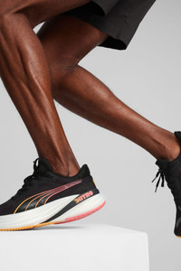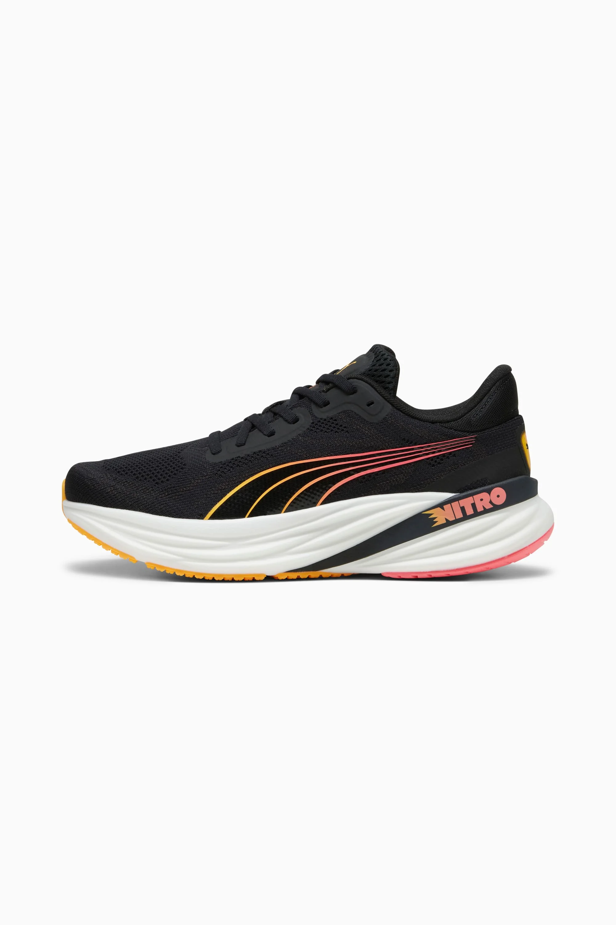 PRODUCT STORY This shoe has the thickest piece of NITROFOAM™ in the entire RUN PUMA line-up. Simply put, you get more of the good stuff in a shoe that is designed for comfort while you run. Beyond the nitrogen-infused foam outsole, you get an engineered knit upper and a moulded heel collar. It's maintenance in all the right places. FEATURES & BENEFITS - NITRO™: Our innovative Nitrogen-infused foam technology is lightweight and provides explosive energy stride after stride. - PUMAGRIP Outsole: Durable rubber compound that provides best-in-class multi-surface traction. DETAILS - Style: 310004_01 - Color: PUMA Black-Sun Stream-Sunset Glow - Engineered knit upper - Lace closure - 10mm heel-to-toe drop - Recommended for: road running - Mileage/Lifespan: 800km - Pronation level: Neutral - PUMA Formstrip on lateral side - Shoe weight: 274g (UK 8) MATERIAL INFORMATION - Midsole: 100% Synthetic - Sockliner: 100% Textile - Outsole: 100% Rubber - Upper: 70% Textile, 30% Synthetic - Lining: 100% Textile