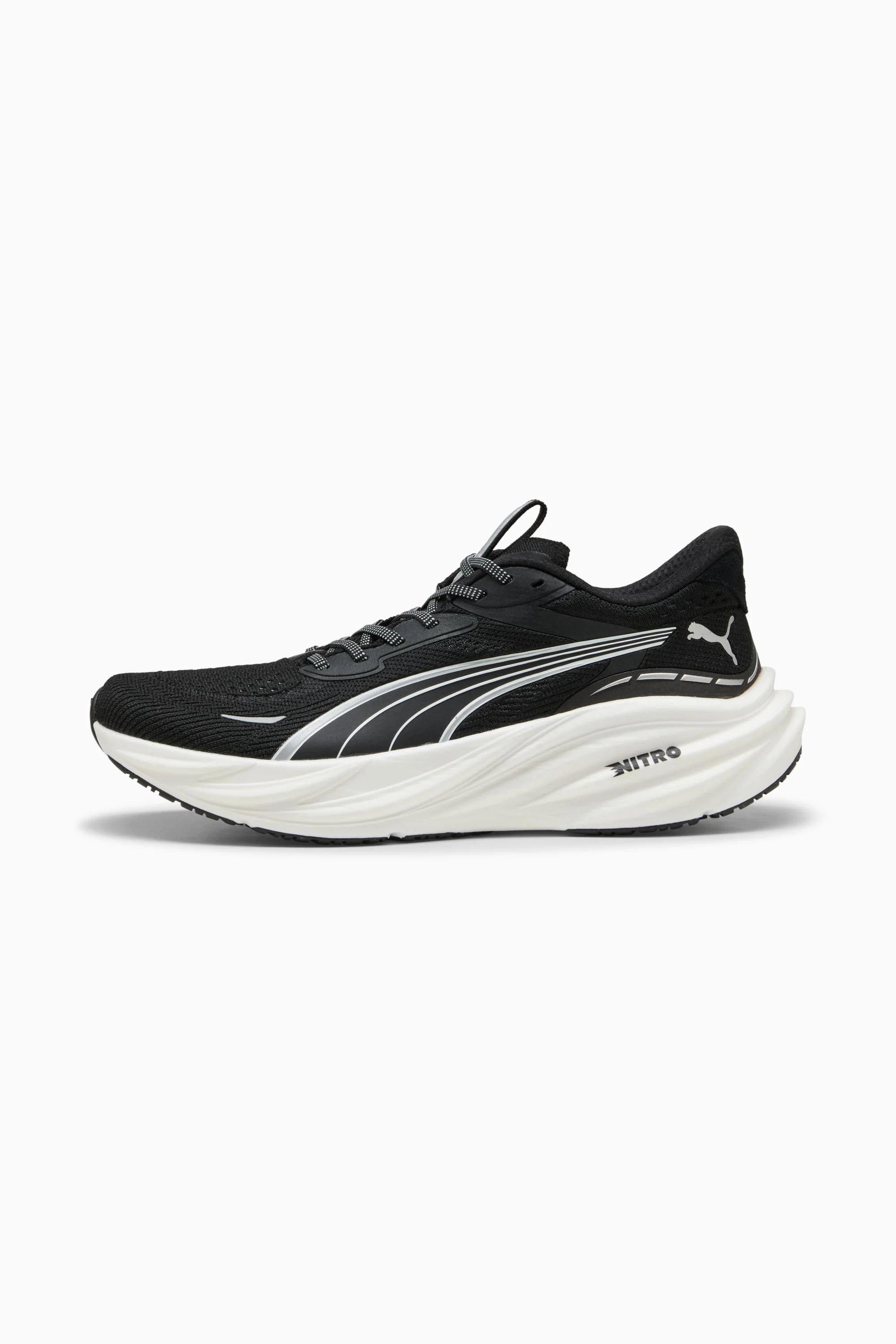 PRODUCT STORY Magnify 3 is built for supreme cushioning and all-day comfort. Designed for any run where softness and support matter most, it features a breathable engineered mesh upper and stacked NITROFOAM™ cushioning for a smooth, responsive ride. Whether you're going the distance or running purely for the joy of it, this shoe is made to magnify your comfort and keep you moving. FEATURES & BENEFITS - BREATHABILITY: Premium engineered knit material engineered for breathability and stretch, reinforced with PWRTAPE for durability and lockdown - NITROFOAM™: Innovative nitrogen-infused foam technology that uses premium raw materials to provide maximum energy return - PUMAGRIP: Outsole is made of durable rubber compound for multi-surface traction - The upper of the shoes is made with at least 30% recycled materials. DETAILS - Style: 311046_01 - Color: PUMA Black-PUMA White - Fit: Regular - Toe type: Rounded - Fastener: Laces - Heel type: Flat - Heel-to-toe drop: 10mm - Stack Height: 40mm / 30mm - Weight (UK8): 260g - Recommended for neutral pronators