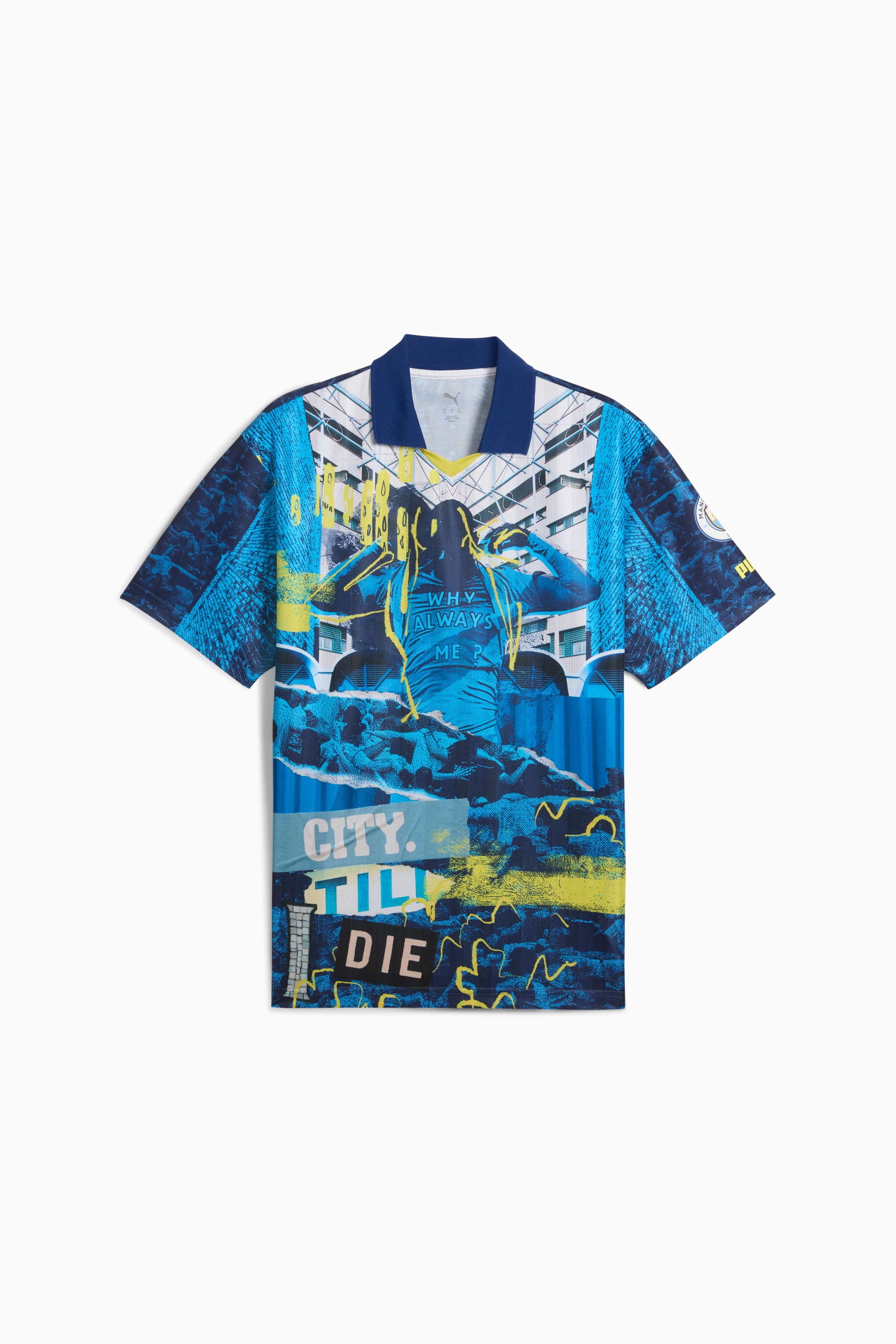 PRODUCT STORY Show your true colors, Cityzens! This retro jersey features a multi-layered silicone badge, a retro design and the PUMA Cat logo on the chest. Crafted from polyester jacquard, it's perfect for cheering at the Etihad Stadium or repping your team every day. FEATURES & BENEFITS - Made with at least 50% recycled materials DETAILS - Style: 779126_75 - Color: Bright Aqua-Blazing Blue - Regular fit - Pique material - Regular length - Crew neck - Short sleeves - All-over print retro graphic - Multi-layered Manchester City silicone badge - PUMA Cat logo placed on the left sleeve