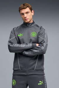 PRODUCT STORY The KING Anthem Collection channels retro vibes with a modern twist, worn by players during their walkouts before every game. With bold, vintage-inspired designs, this apparel honours your club’s legacy while showcasing your pride. Whether on the field or off, this collection brings timeless style and contemporary comfort, making it a true symbol of loyalty and tradition. FEATURES & BENEFITS - dryCELL: Highly functional materials draw sweat away from your skin and help keep you dry and comfortable during exercise - Made with at least 50% recycled materials. DETAILS - Style: 782173_05 - Color: Galactic Gray-Pro Green - Fit: Slim - Main material: Spacer - Short sleeves - Fastener: Full zip - Length: Standard jacket - Club and PUMA branding details MATERIAL INFORMATION - Trimming: 100% polyester - Shell: 63% polyester, 37% cotton - Pocket Bag: 100% polyester - Rib: 93% polyester, 7% elastane