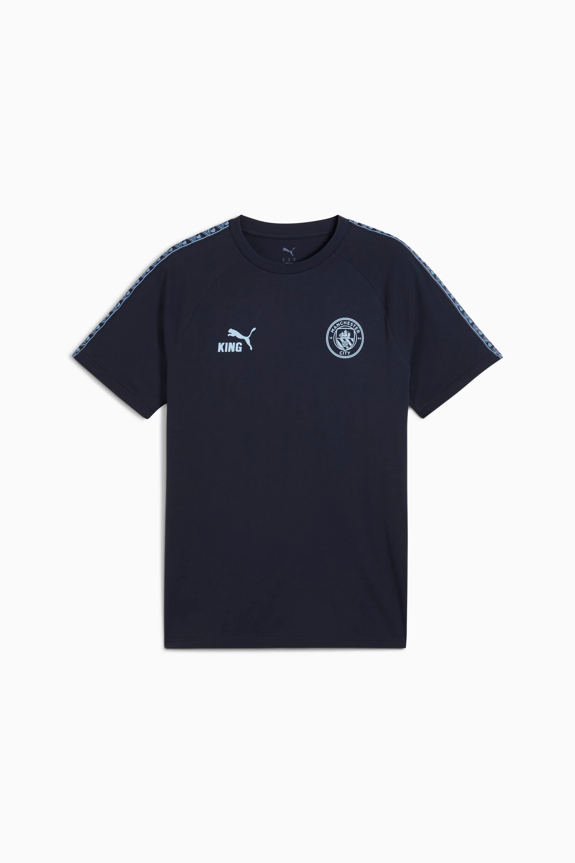 PRODUCT STORY Crafted for those who command the game, the KING collection blends heritage-inspired design with modern innovation. Featuring premium materials and high-quality materials, it delivers ultimate touch, control, and comfort. Worn by top football clubs, this collection embodies the legacy of KING, where tradition meets performance. FEATURES & BENEFITS - Made with at least 20% recycled cotton. DETAILS - Style: 782697_06 - Color: Deep Navy-Team Light Blue - Fit: Regular - Main material: Single jersey - Neck: Crew neck - Short sleeves - Length: Regular - Club and PUMA branding details MATERIAL INFORMATION - Trimming: 100% polyester - Shell: 100% cotton - Rib: 71% cotton, 29% polyester