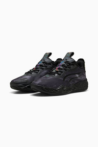 PRODUCT STORY MB.04 Lo is inspired by Melo's out-of-this-world style of play, featuring an all-over alien texture on the upper and Melo's wings logo wrapped around the heel. Designed with breathable, supportive double-layered mesh and NITROFOAM™ cushioning for on-court power, this Team Pack's bold and vibrant colors are sure to stand out on the court. FEATURES & BENEFITS - ENGINEERED MESH UPPER: multi-zoned materials for targeted support, breathability and comfort - NITROFOAM™: Advanced nitrogen-injected foam designed to provide superior responsiveness and cushioning in a lightweight package DETAILS - Style: 312174_01 - Color: PUMA Black-Dark Amethyst - Regular fit - Rounded toe - Lace closure - Lining: Textile - Outsole: High abrasion tread pattern for added traction with non-slip rubber compounds - Outsole features with hovering spaceship design, NOT FROM HERE and RARE wording, and flames on the heel - External heel cap: Melo's Wings Logo wrapped around the heel MATERIAL INFORMATION - Midsole: 100% Synthetic - Sockliner: 100% Textile - Outsole: 100% Rubber - Upper: 67% Textile, 33% Synthetic - Lining: 100% Textile