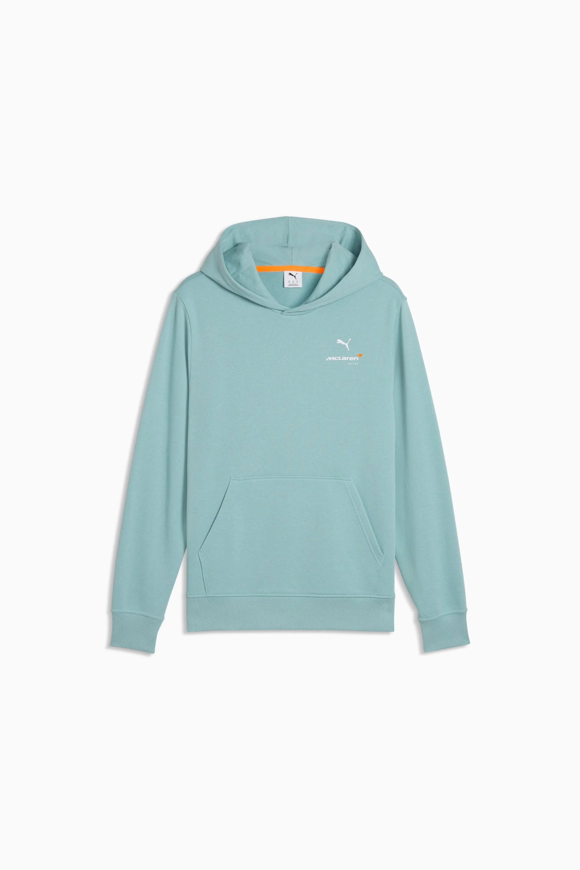 PRODUCT STORY Feel the adrenaline every time you pull on this McLaren Racing Essentials Hoodie. Bold graphics and iconic Cat Logo offer style and pure motorsport energy. It has a soft feel that helps keep you comfortable, whether you're trackside or taking city streets at your own pace. FEATURES & BENEFITS - Made with at least 50% recycled materials. DETAILS - Style: 637447_05 - Color: Seafoam - Fit: Regular - Main material type: Terry - Hooded - Long sleeves - Length: Regular - PUMA and McLAREN racing branding details MATERIAL INFORMATION - Hood Lining: 100% cotton - Shell: 68% cotton, 32% polyester - Rib: 97% cotton, 3% elastane