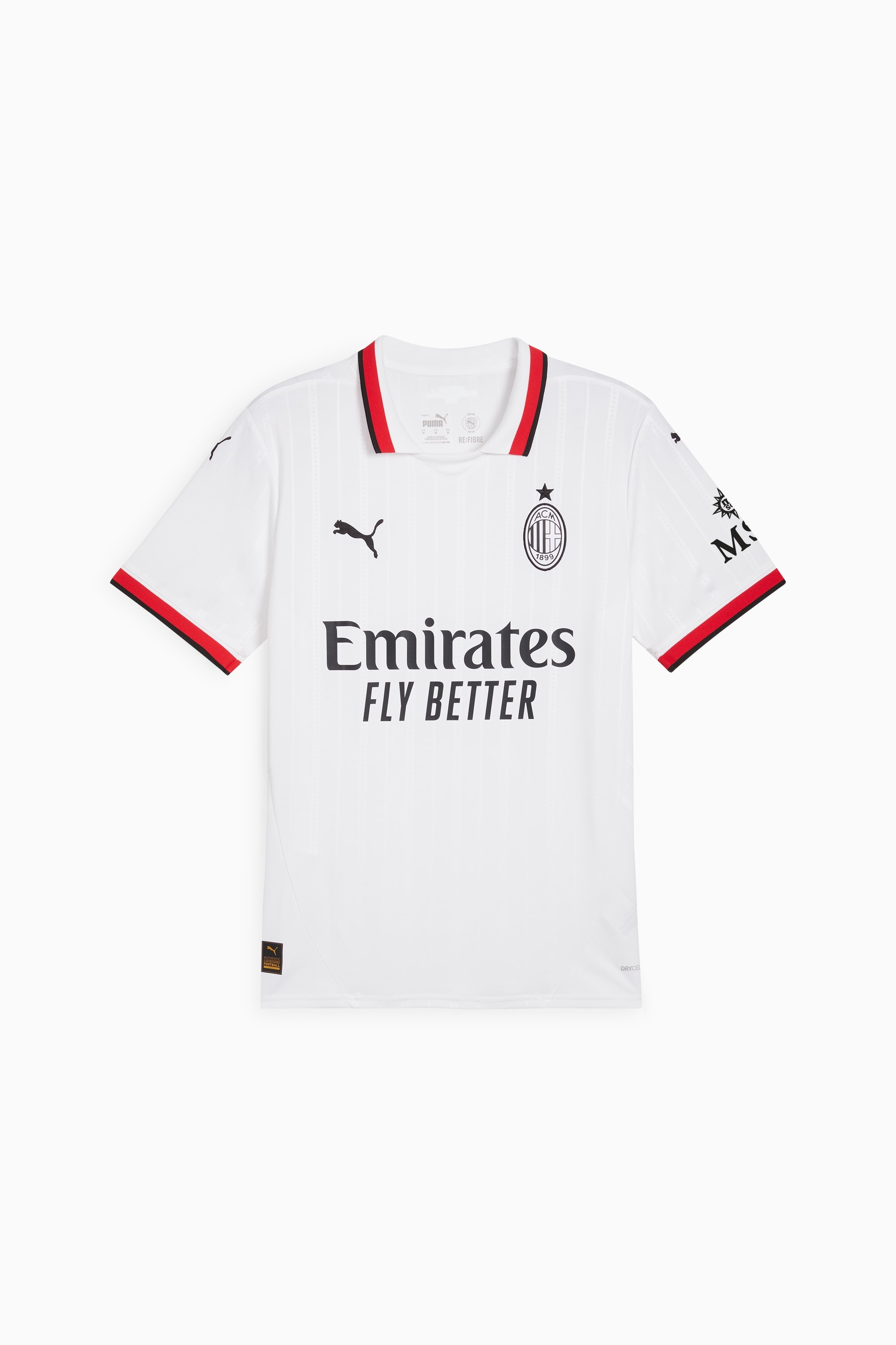 PRODUCT STORY Details make all the difference in the 24/25 AC Milan Away Kit. The classic white away combined with a red-and-black polo collar and monochromatic crest personifies the spirit of success and casual sophistication of a team synonymous with the Beautiful Game. Designed for the fans, Replica jersey pairs the same match-worn look with a casual silhouette, details, and materials, ideal for both game day and everyday wear. FEATURES & BENEFITS - COMFORT: dryCELL sweat-wicking technology designed to keep you dry and comfortable - RE:FIBRE: Contains at least 95% recycled textile waste and other used materials made of polyester DETAILS - Style: 775015_02 - Color: PUMA White - Regular fit - 170 gsm, Jacquard - Official team branding - PUMA branding details - Part of the AC Milan 24/25 Away Kit MATERIAL INFORMATION - SHELL: 100% polyester - RIB: 97% polyester, 3% elastane