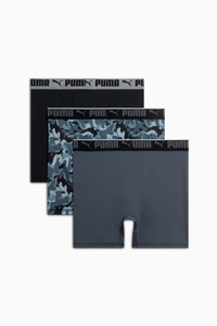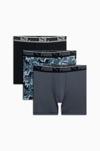 PRODUCT STORY Start your day with confidence and comfort with these essential boxer briefs, boasting a camo colorway and PUMA branding. DETAILS - Style: 942713_02 - Color: BLACK / GREY - 90% recycled polyester, 12% spandex - Pack of three - PUMA branding details