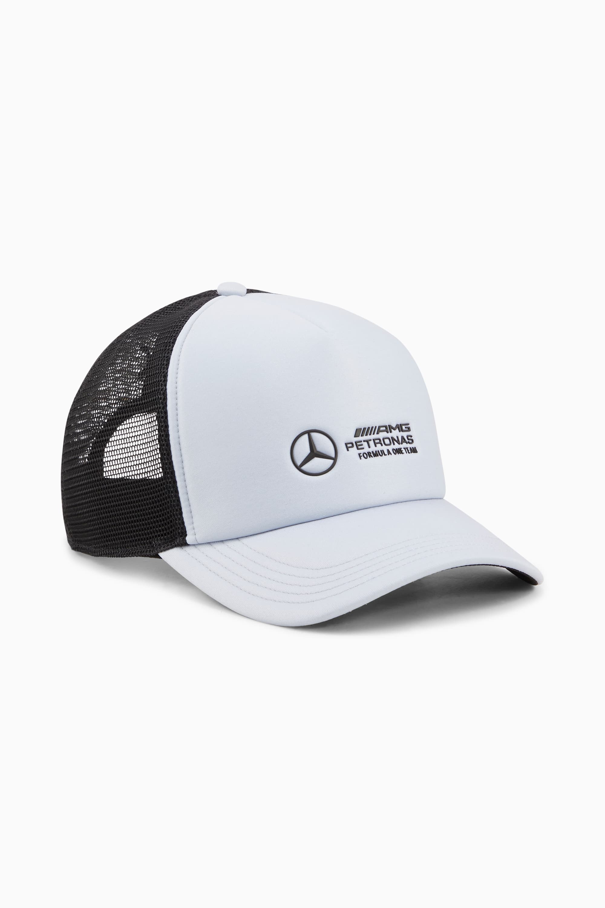PRODUCT STORY Accelerate your style with this breathable trucker cap with a snapback closure and premium Mercedes-AMG Petronas F1® logo on the front. FEATURES & BENEFITS - Made with at least 30% recycled material DETAILS - Style: 025696_02 - Color: Mercedes Team Silver - Curved brim - Snapback closure - 5-panel trucker cap, with breathable mesh - Shell: 100% polyester; front lining: 100% polyester woven - Premium MAPF1 logo on the front panel - Embroidered PUMA Cat on the back panel MATERIAL INFORMATION - SHELL: 100% polyester - FRONT LINING: 100% polyester