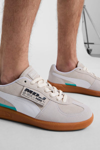 PRODUCT STORY The Palermo goes to Miami. Speeding through the intersection of style and motorsport, Mad Dog Jones joins forces with Mercedes-AMG PETRONAS F1® Team and PUMA to create this dynamic collaboration. This limited collection combines the championship spirit of Mercedes-AMG PETRONAS F1® Team, Miami, and the retro-futurism of Mad Dog Jones. Everything lasts forever… DETAILS - Style: 308479_01 - Color: PUMA White-Warm White - Suede base - Leather formstrip and FOT - Suede tongue with debossed PUMA branded label and mesh backing - Foil printed PUMA branding on quarter panel flap - Screen printed PUMA branding on FOT - Synthetic leather lining - Laces - Rounded toe MATERIAL INFORMATION - Midsole: 100% Synthetic - Sockliner: 100% Textile - Outsole: 100% Rubber - Upper: 74.39% Leather - cow, 24.97% Synthetic, 0.64% Textile - Lining: 100% Textile