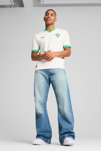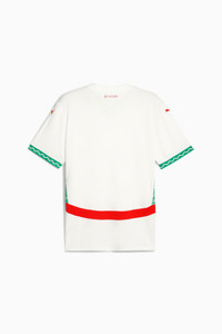 PRODUCT STORY With nods to Morocco’s proud heritage, including details drawn from traditional Berber motifs, the Morocco Away Kit is all about celebrating Moroccan roots – and the reach of Moroccan culture. FEATURES & BENEFITS - dryCELL: Performance technology designed to wick moisture from the body and keep you free of sweat during exercise - As part of the RE:FIBRE program, this garment is made of at least 95% recycled material from textile waste and other used materials DETAILS - Style: 777706_02 - Color: PUMA White-Fast Green-PUMA Red - Regular fit - Double face jacquard material - Regular length - Crew neck and rib cuffs construction - Small mesh side inserts crossing side panels - Short sleeves - Mesh curved side panels - FRMF badge placed on left chest and PUMA Cat logo placed on right chest MATERIAL INFORMATION - Shell: 100% polyester - Rib: 97% polyester, 3% elastane