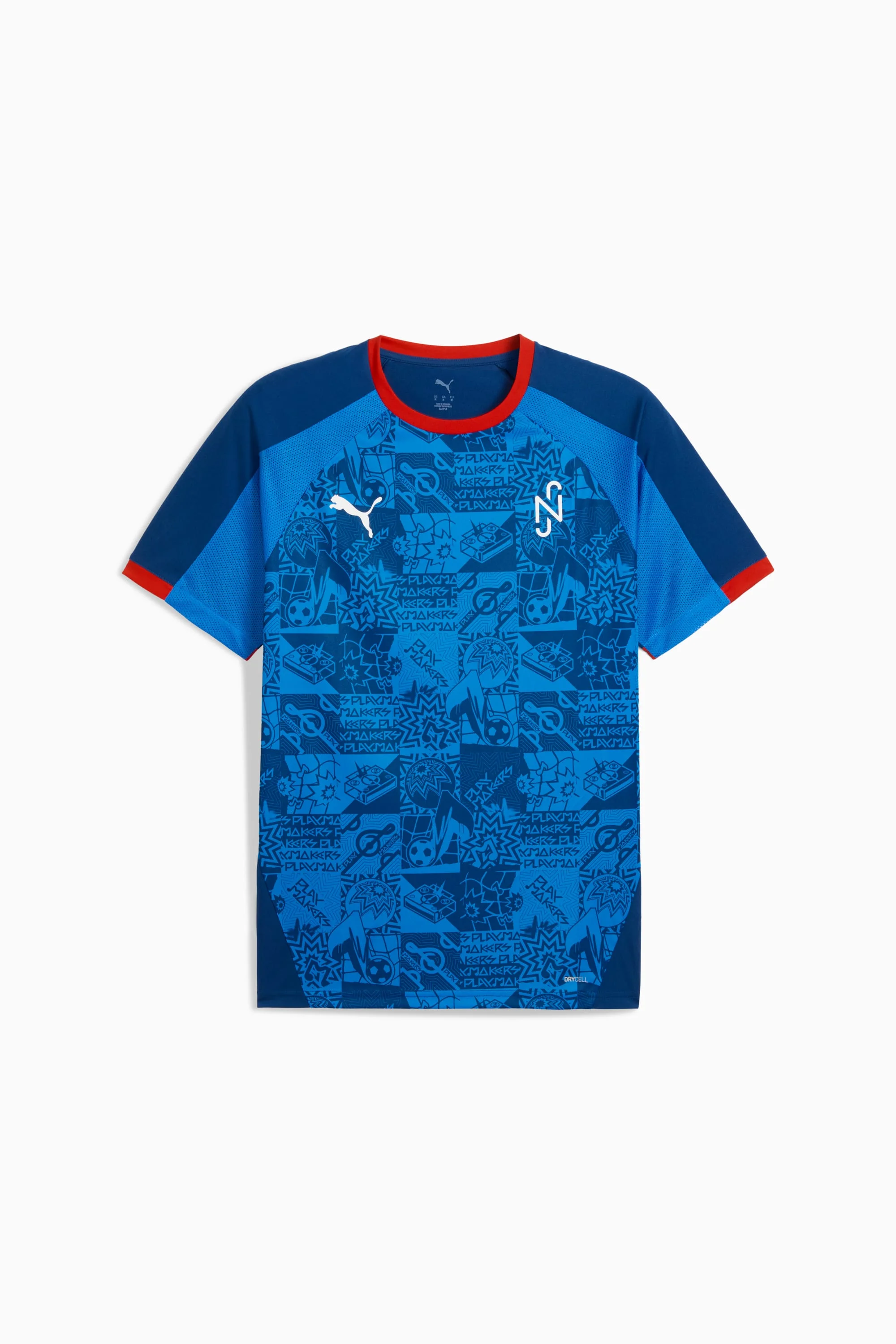 PRODUCT STORY Creativity starts here. The first-ever Neymar Jr Playmaker pack celebrates the fearless flair and vision that define soccer's greatest #10s. This collection features bold graphics and standout colors that channel Neymar Jr's brilliance on the field. Designed for those who create, inspire, and make the impossible look easy. FEATURES & BENEFITS - Made with 100% recycled material excluding trims & decorations. DETAILS - Style: 660314_10 - Color: Blazing Blue-PUMA White-Ultra Blue - Fit: Regular - Main Material: Interlock - Neck: Crew neck - Short sleeves - Colour pops with sleeve cuffs and collar - Length: Regular - Neymar Jr branding details - PUMA branding details MATERIAL INFORMATION - Inserts: 100% polyester - Shell: 100% polyester - Sleeve Cuff: 100% polyester